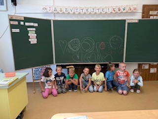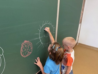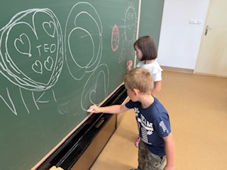 Nechybělo ani psaní na tabuli, které děti moc bavilo. První týden nám ukázal, že učení může být zábava a těšíme se na další společné dny! (02.09.2025)