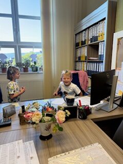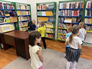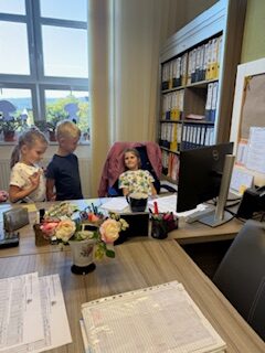 Prozkoumali jsme školu – navštívili knihovnu, jídelnu, tělocvičnu a také ředitelnu, kde nás paní ředitelka srdečně přivítala. Děti si dokonce mohly na chvíli sednout za její stůl a zahrát si na paní ředitelku a pana ředitele.
