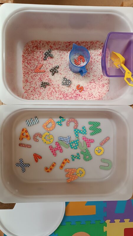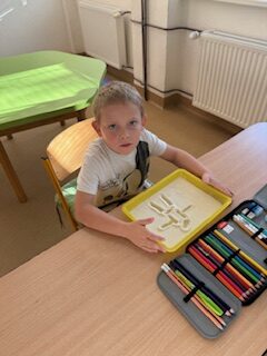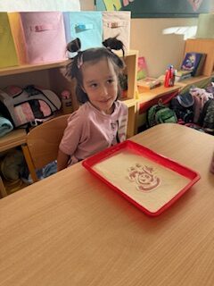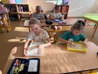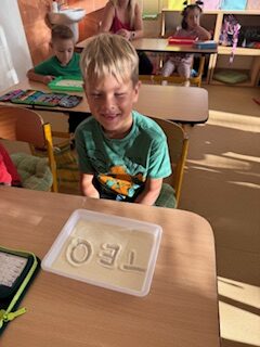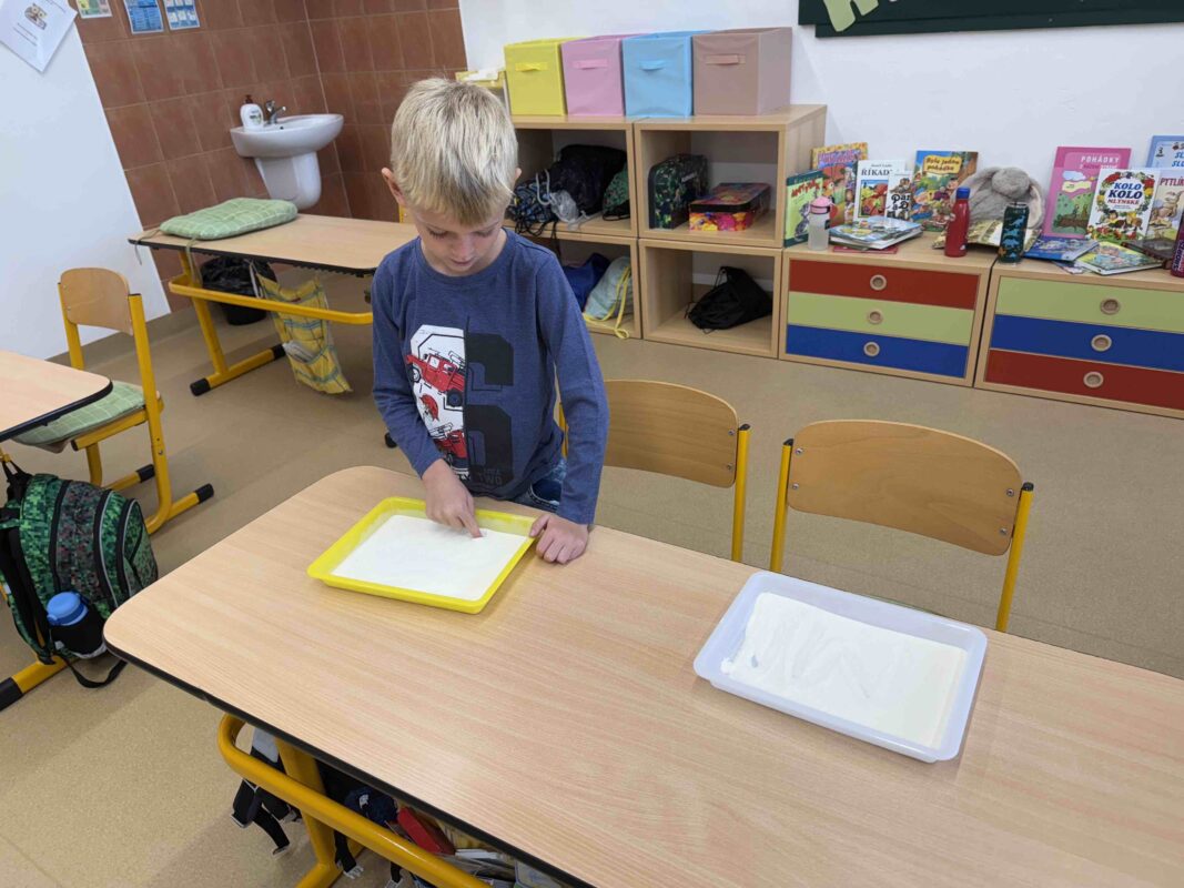 Tentokrát jsme si ve třídě užili opravdu hravé učení. Děti měly možnost psát písmena a slova do mouky, což bylo nejen zábavné, ale také skvělé pro rozvoj jemné motoriky a nácvik psaní.