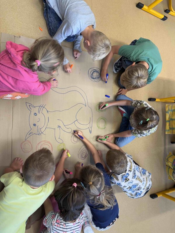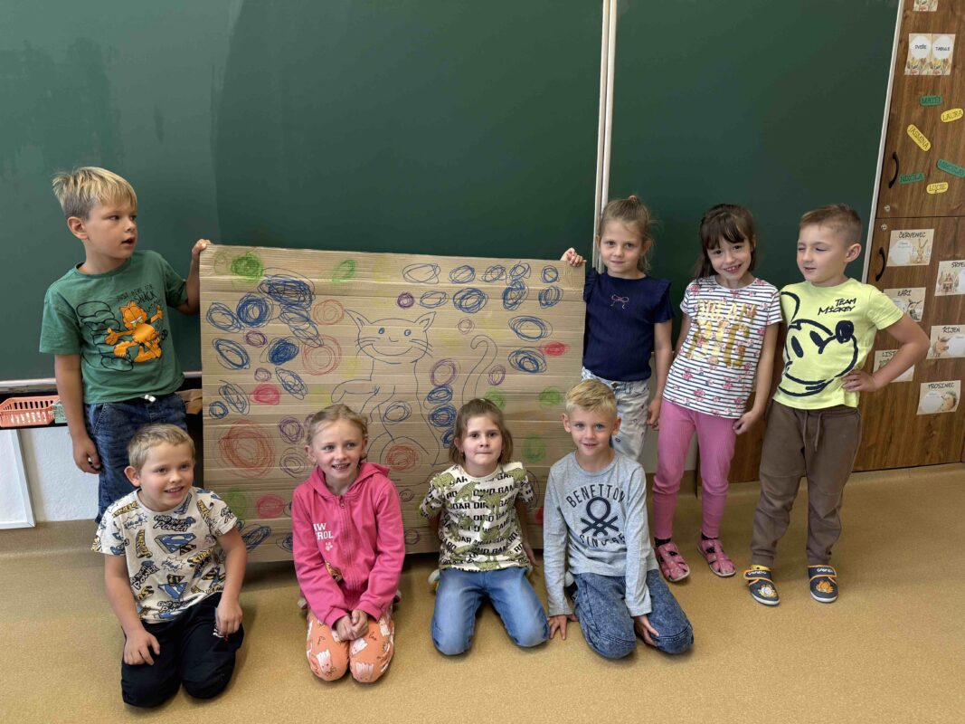Začali s grafomotorickými cviky, které pomáhají dětem procvičit ramenní kloub, loket i zápěstí. Aby to nebyla jen obyčejná rozcvička, pojali jsme cvičení hravou formou. Naše kočička dostala spoustu krásných klubíček na hraní a drakovi jsme dokreslili barevné ocásky. Pracovali jsme ve skupinách, a tak si děti kromě procvičení ruky vyzkoušely také spolupráci, vzájemnou pomoc a utužily své vztahy. Celé dopoledne se neslo v duchu radosti, fantazie a společného tvoření. (11.09.2025)