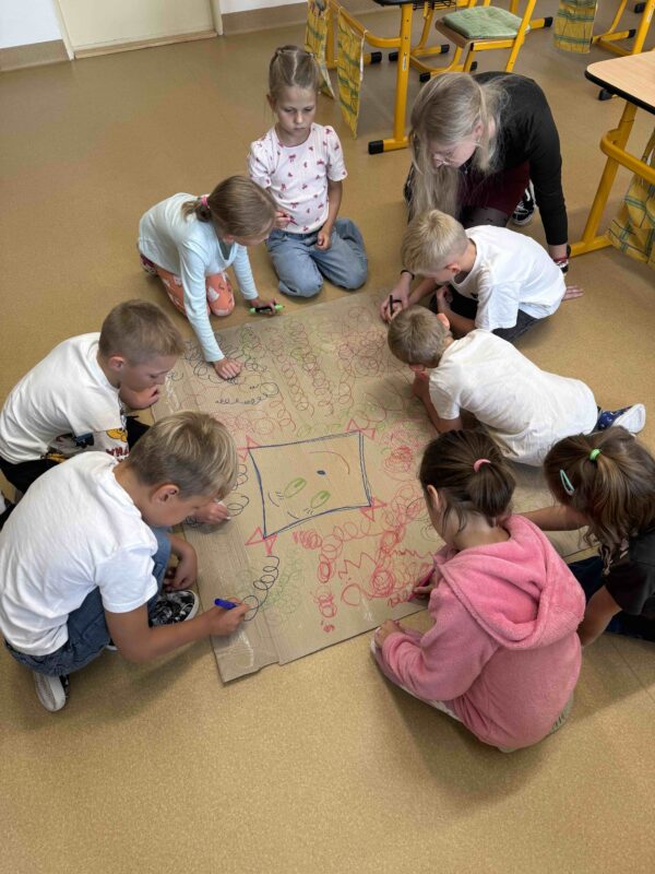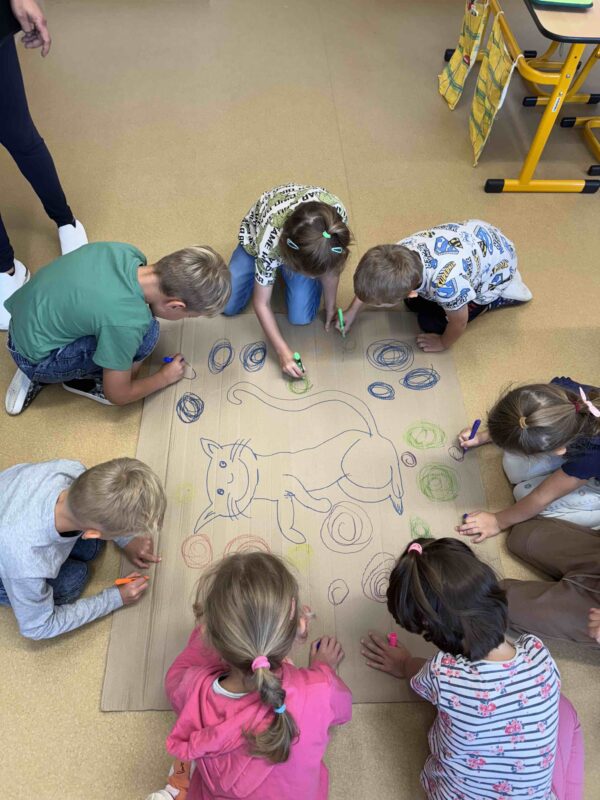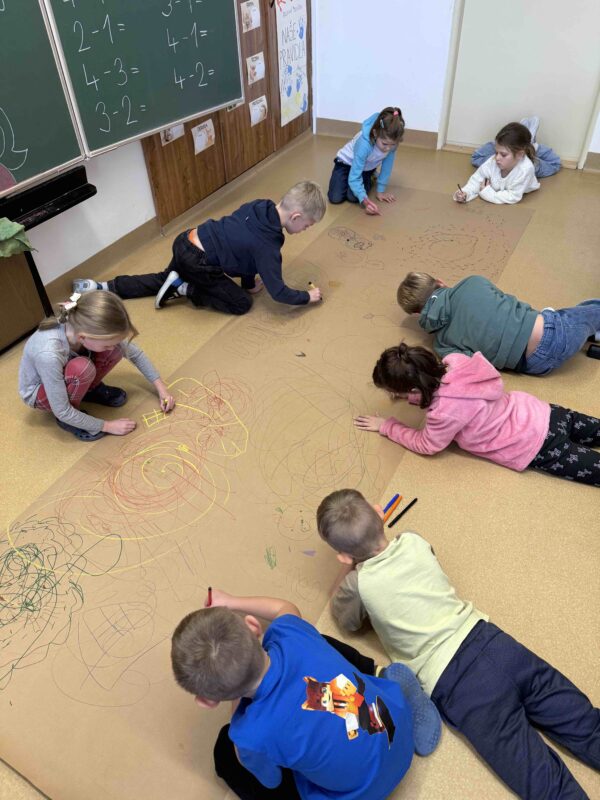 V první třídě jsme si zpestřili procvičování grafomotoriky trochu jinak – s hudbou. Při poslechu skladeb Bedřicha Smetany jsme nechali ruku volně klouzat po papíře a „tančit“ podle rytmu. Nejprve děti kreslily v lavicích a s každou částí hudby měnily místo, aby zkusily jiný pohled i prostor. Nakonec jsme tvořili na velký společný papír, kde se čáry a barvy propojily v krásnou hudební kresbu.