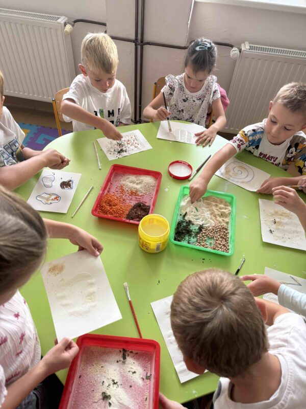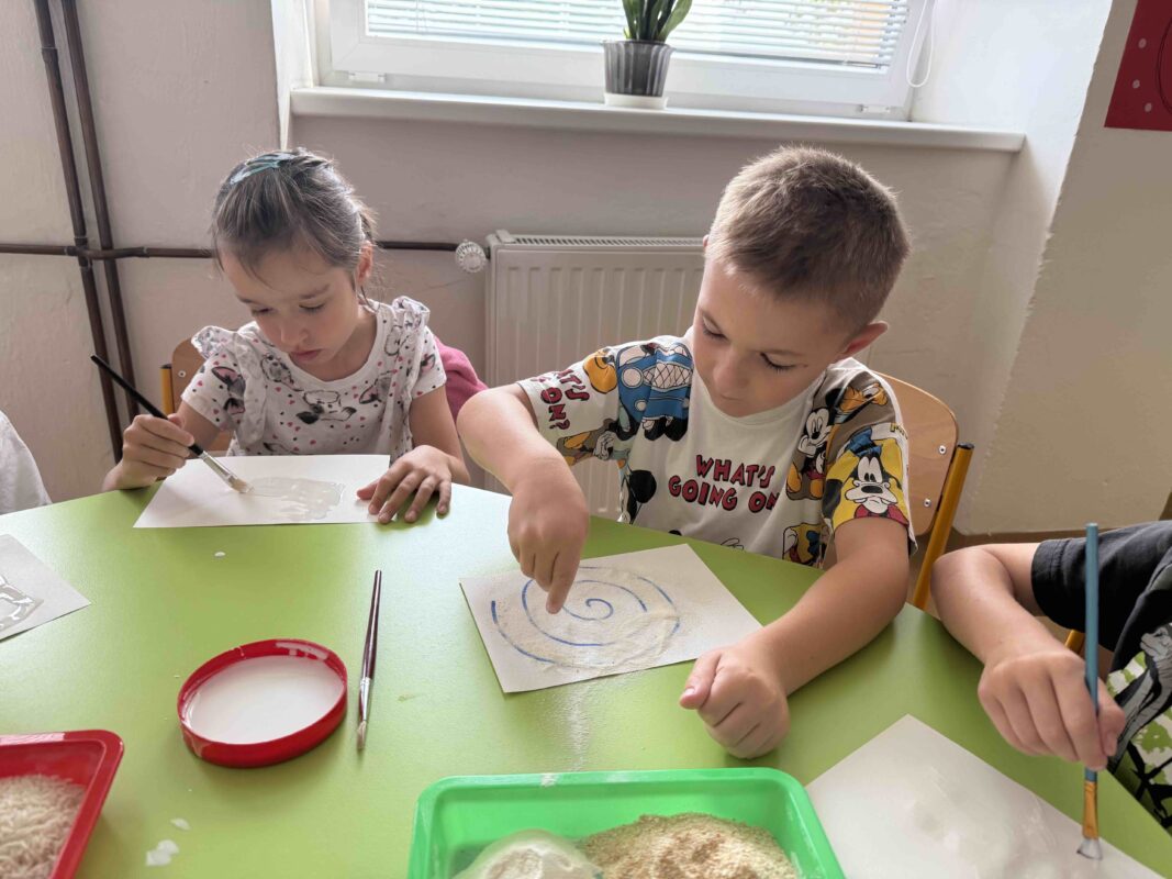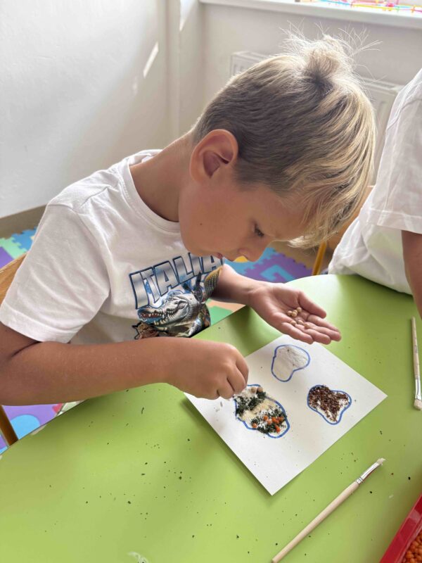 Máme za sebou první hodinu pracovních činností, kterou jsme věnovali cvičení jemné motoriky. Děti pracovaly s lepidlem a netradičními kuchyňskými potřebami – využili jsme čaj, rýži, mouku, strouhanku, čočku a další suroviny. Výsledkem byly krásné a originální obrázky, na kterých si děti vyzkoušely nejen tvořivost, ale i trpělivost a pečlivost. Práce je velmi bavila a už teď se těší na další hodiny plné tvoření. (11.09.2025)