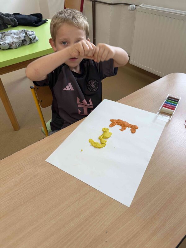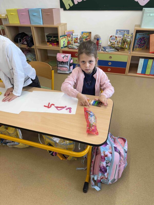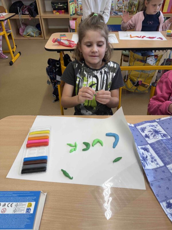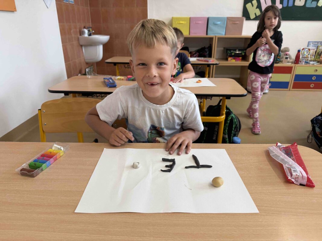 V první třídě jsme se pustili do oblíbené činnosti – práce s plastelínou. Cílem bylo nejen procvičit jemnou motoriku prstů, ale také propojit ji s naší výukou čtení a psaní. Nejprve jsme společně modelovali písmenka, která už známe, a trénovali tak jejich tvary. Někteří žáci se pustili do náročnějšího úkolu a z plastelíny vytvořili i svá vlastní jména. Po pilné práci následovala zasloužená chvilka volného tvoření, během níž se děti mohly naplno rozběhnout svou fantazií a vymodelovat cokoli, co je napadlo – od zvířátek až po různé drobné předměty. (29.09.2025)