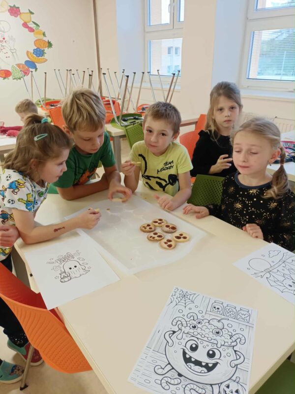 V pátek nás čekalo završení celého týdne – strašidelná hostina. Společně jsme si připravili linecká strašidelná kolečka, párečky v těstíčku a zkusili jsme upéct i pusinky, i když ty se nám úplně nepovedly, protože, jak jsme zjistili, jsou náročné i pro zkušené kuchaře. Ale jak se říká – i pokus se cení! K jídlu jsme měli také pavučinky a krvavé pití. Celou hostinu jsme si nakonec vychutnali u strašidelné pohádky, která nás příjemně naladila a uzavřela celý náš kouzelný týden.