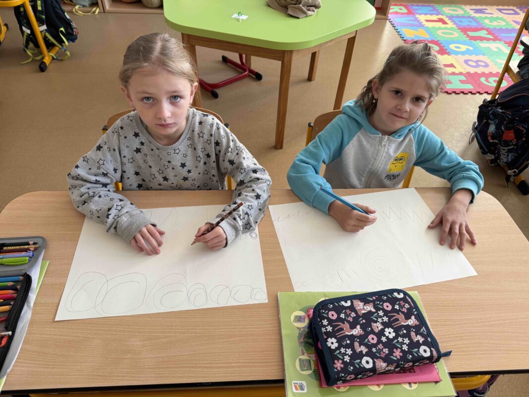 ČEŠ – uvolňovací cviky (ramenního kloubu, zápěstí a ruky), správné sezení a držení ruky u psaní, domaluj obrázek podle řady, hledání stejných tvarů, rozpoznání dlouhé a krátké slabiky – vytleskávání