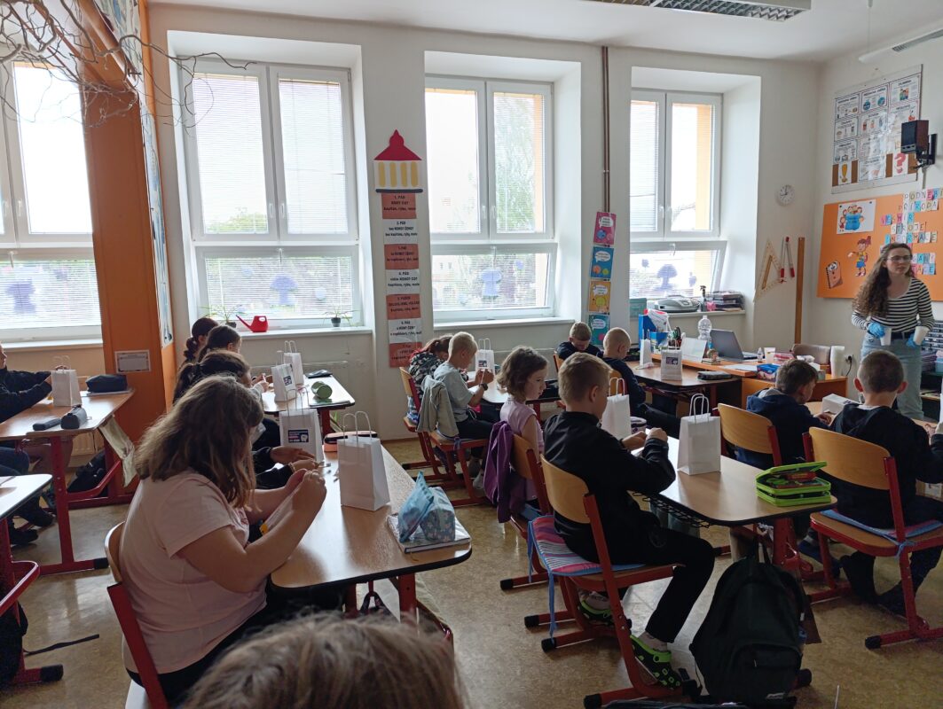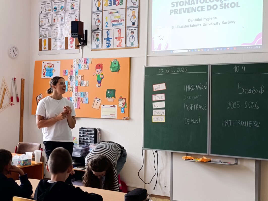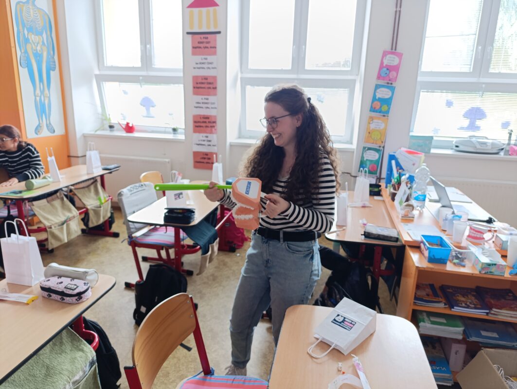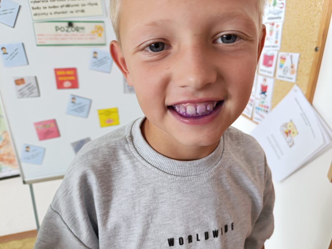 Ve středu k nám do školy přijela zubní sanitka a z ní vyskčily studentky zubního lékařství z /rahy, které nám vysvětliny všecny důležité věci o zubech. A hlavně nás učily si naše zuby dobře vyčistit. K tomu jsme dostali kastéček, patu, nějaké létačky a obarvenou vodu, která nám ukázala, kde máme hodně zubního plaku. Nakonec se ti, kteří měli souhlas rodičů, podívali do samotné sanitky. Tam na ně čekal příjemný pan zubař se svou asistentkou a ten jim zoubky pořádně zkontroloval a do knížečk popsal, kde mají nějaké kaz. Všechno proběhlo v úplném klidu a beze strachu.