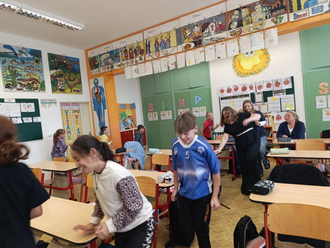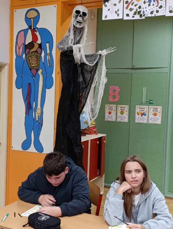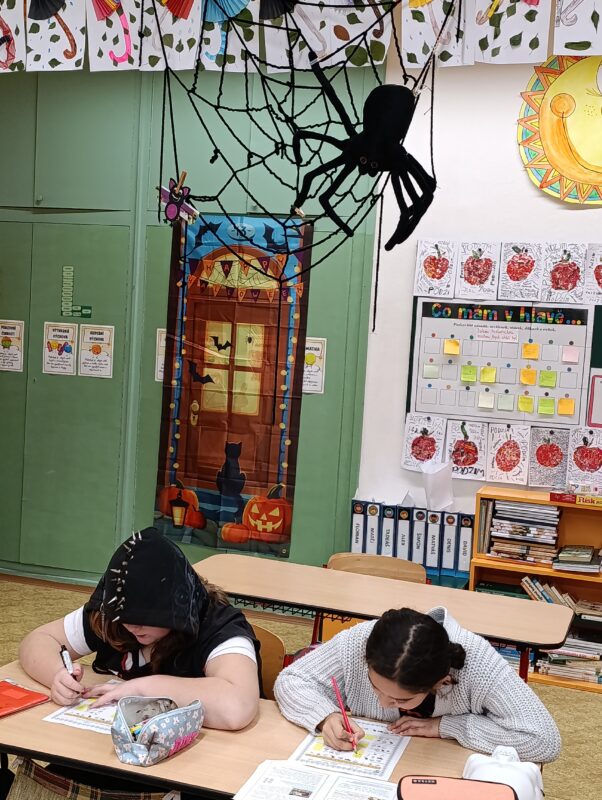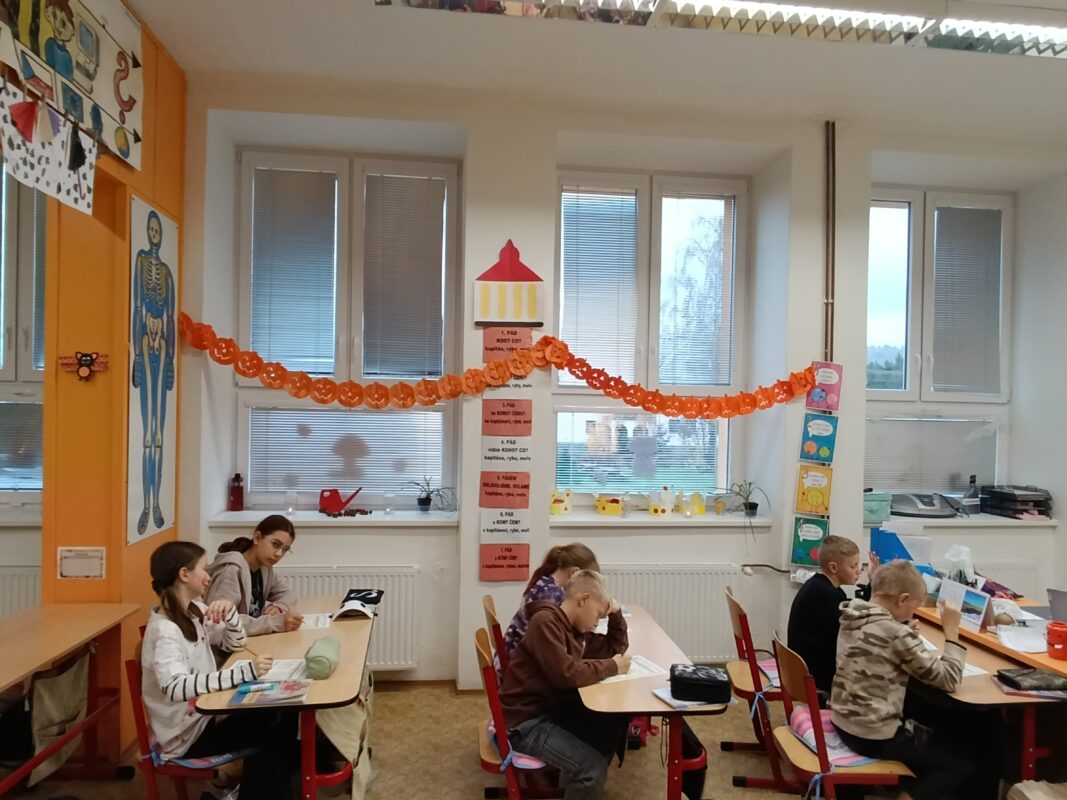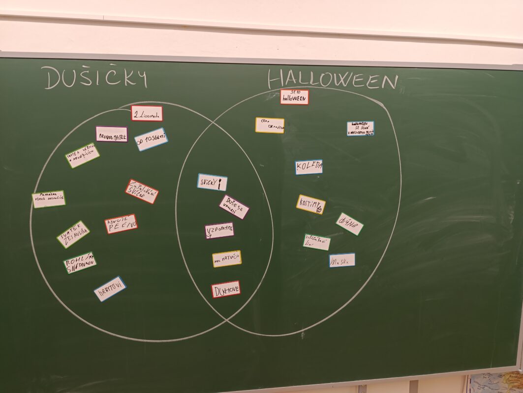 V páté třídě jsme si po návratu z prodloužených prázdnin ujasnili, jaký je rozdíl mezi naším svátkem Všech svatých a anglickým Halloweenem. Z pracovního listu jsme se dozvěděli základní informace, jejich pochopení jsme si ověřili v tabulkách pravdivosti. Do Venových diagramů jsme pak zaznamenávali, co mají oba svátky rozdílné a co společné. Ve třídě nechyběla Halloweenská výzdoba a někteří z nás měli i nějakou tu strašidelnou masku. Ani v matematice jsme se strašidlům nevyhli – čekali na nás v příkladech na pracovním listu.