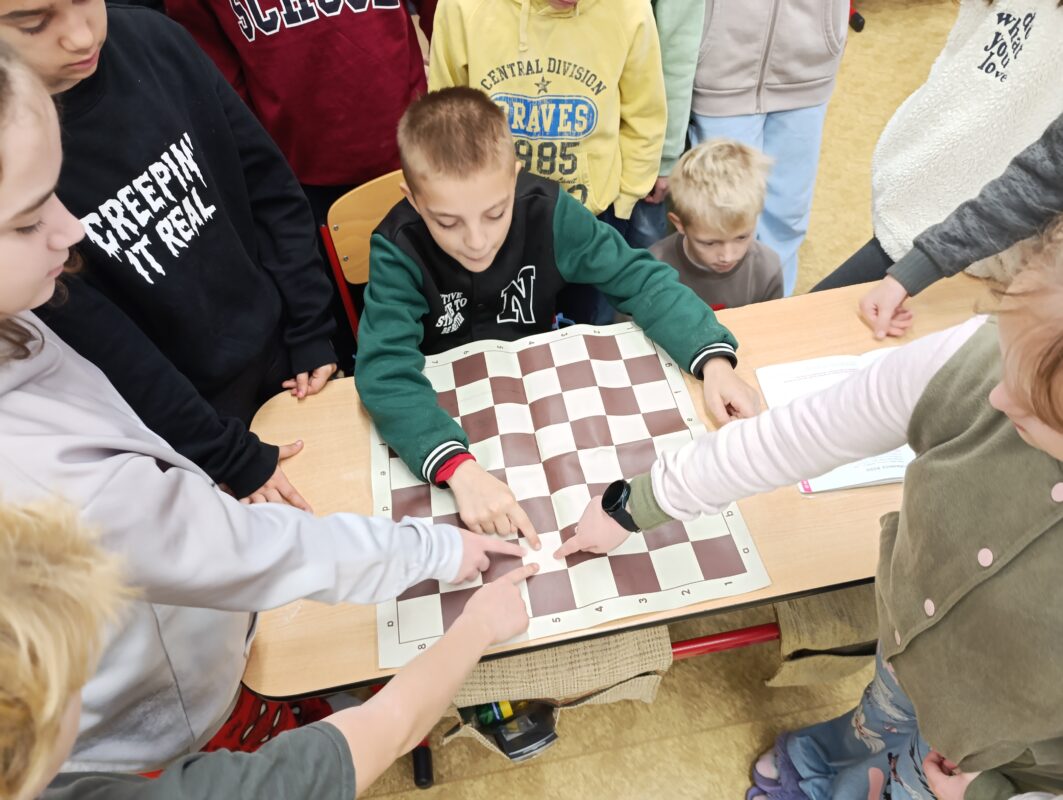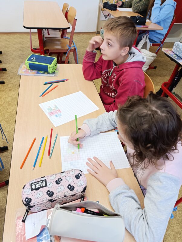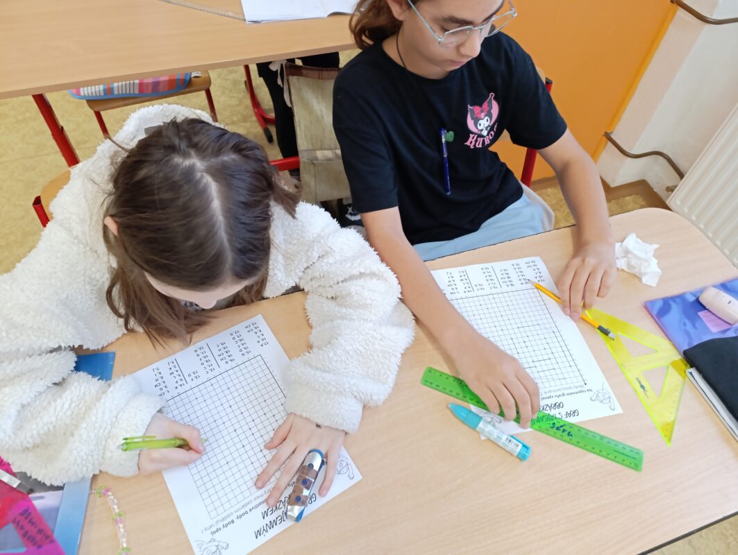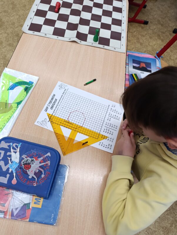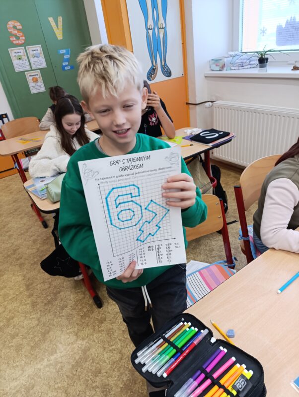 Do geometrie si paní učitelka nachystala zvláštní pomůcky: šachovnici, mapy Krnova, pexeso… Vůbec jsme netušili, co se bude dít. Ale díky těmto pomůckám jsme se naučili, co jsou to souřadnice, naučili jsme se podle nich orientovat, zadávat je, vehledávat body podle souřadnit a nakonec také podle nich nakreslit nebo spíše narýsovat obrázek. Tím nebylo nic jiného než námi oblíbené čislo six seven 🙂