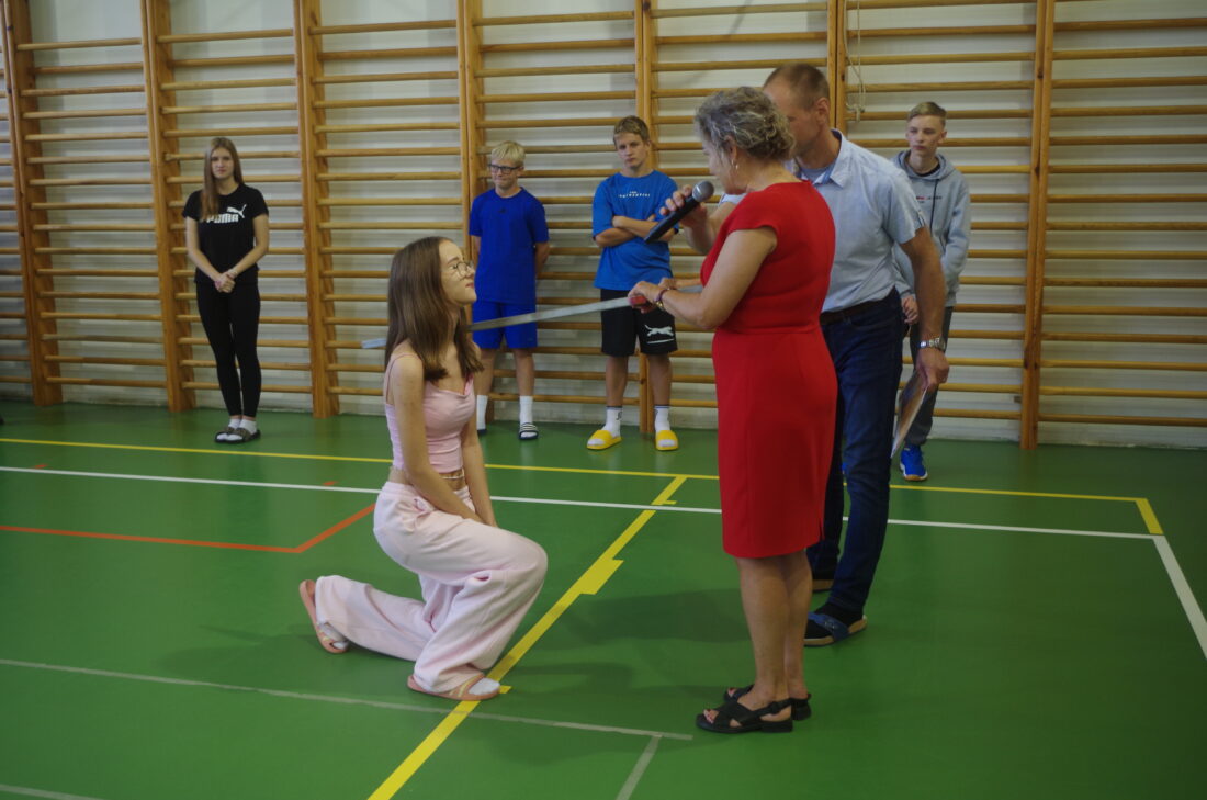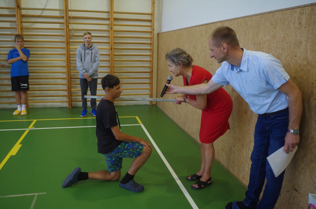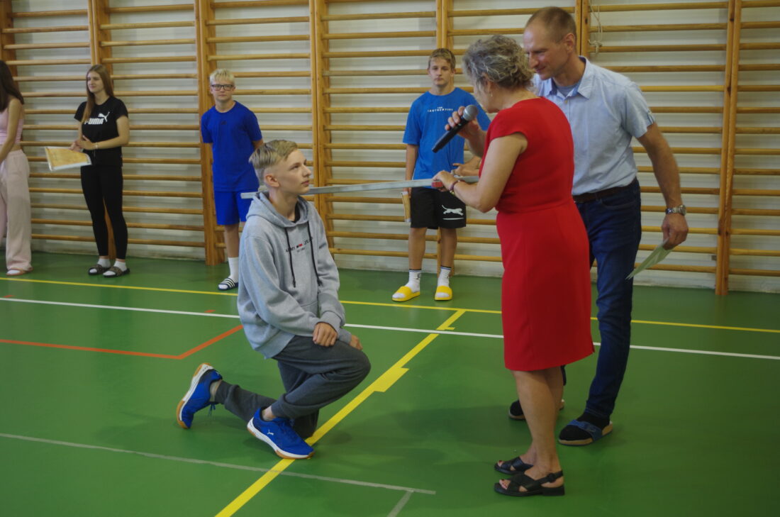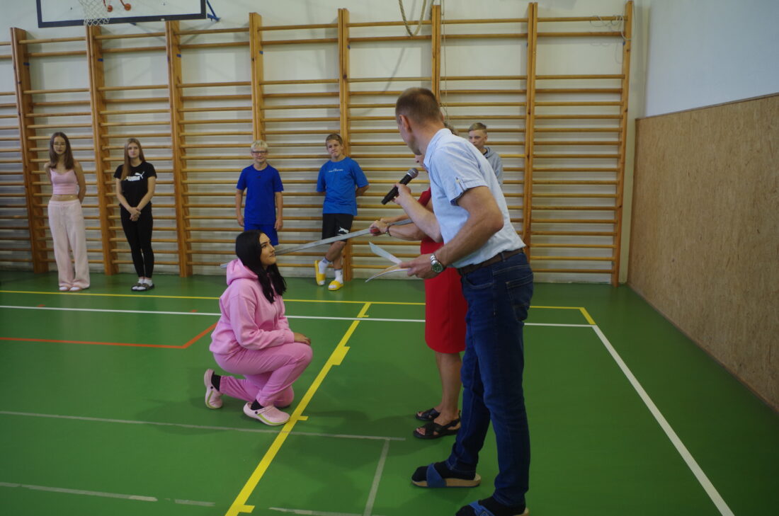 Poté přišel slavnostní okamžik – paní ředitelka pasovala každého deváťáka rytířským mečem. Ačkoli se meč blýskal a působil velice důstojně, naštěstí nikomu neublížil. Maximálně se třem žákům rozklepala kolena – prý z nervozity, ale možná to bylo spíš tím, že v tu chvíli konečně pochopili, že devítka je tu opravdu poslední zastávkou před „velkým světem“.