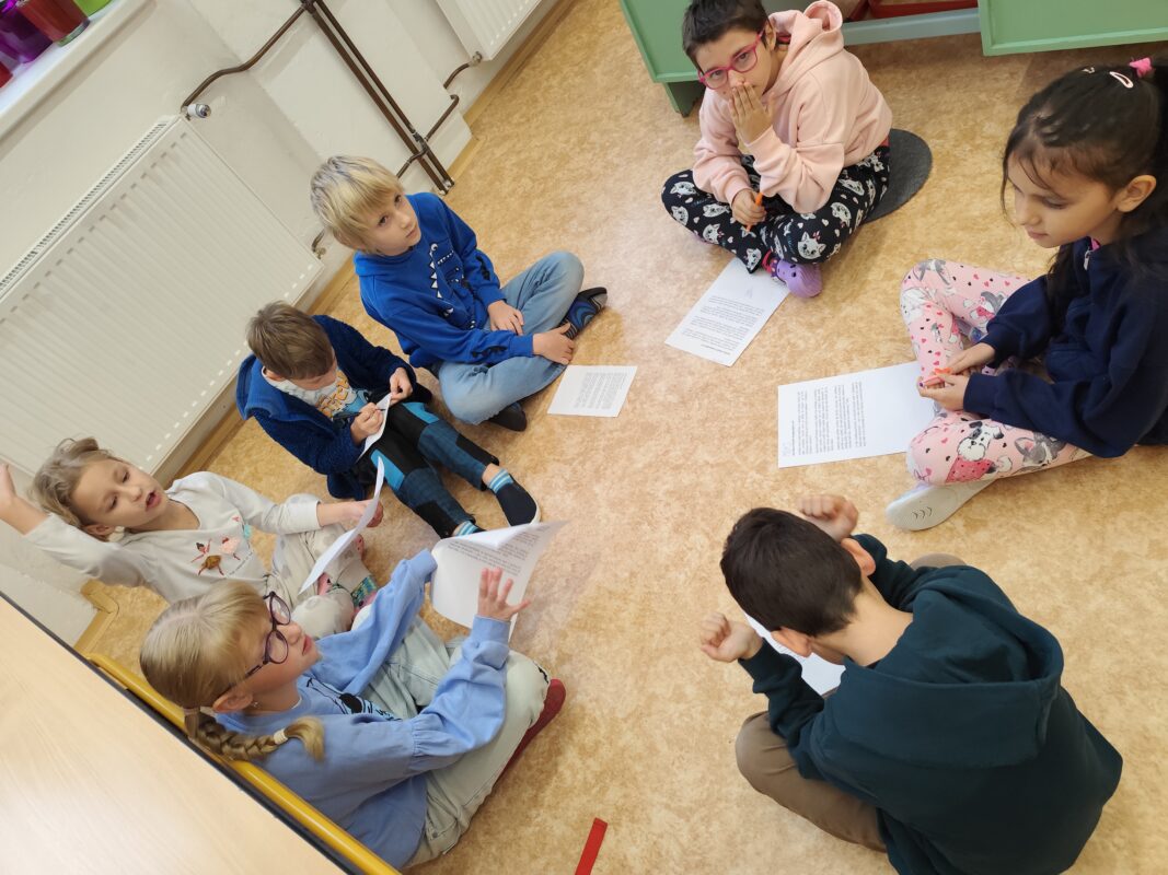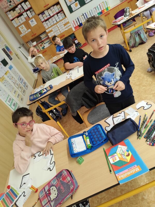 Žáci poctivě dodržovali nastavená pravidla, pracovali v tichosti a s očekáváním, co dalšího přijde. Několika žákům dělalo problém složit z nasbíraných dílků celek – poradili jim jiní spolužáci, lepení proběhlo bez problémů, stříhání bylo pro některé žáky překážkou – neradi stříhají, nejde jim to. Byli ujištěni, že toto se napraví jen tréninkem. Úkol splnili všichni.