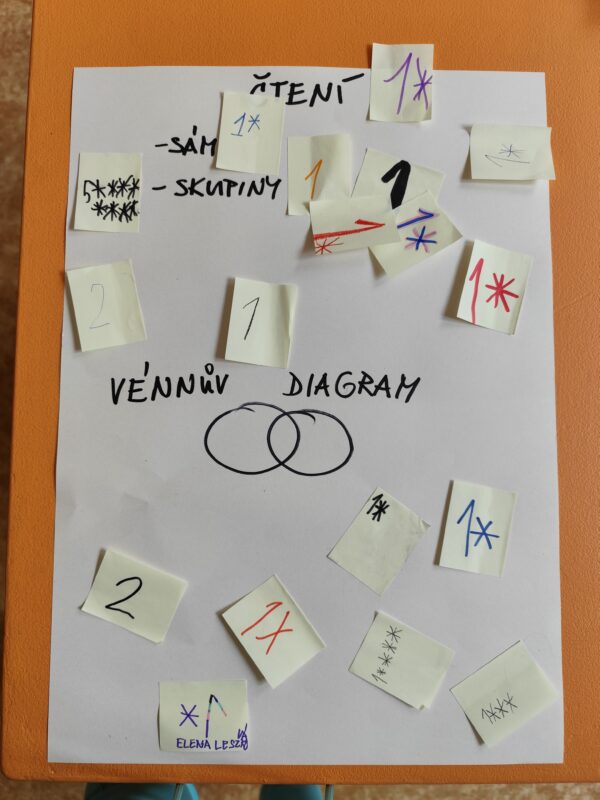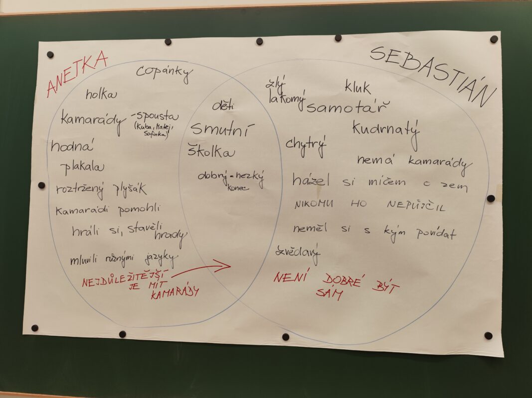 Po sdělení informací se žáci posadili do lavic. Mezi tím byl na tabuli nachystán Vénnův diagram, se kterým se žáci setkali prvně. Po krátkém vysvětlení a uvedení příkladu ale rychle pochopili princip a začali příběhy porovnávat. Hledali, co je společné, co rozdílné – informace zapisovala paní učitelka na připravený papír.