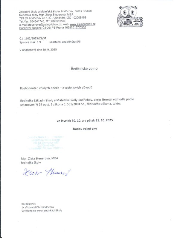 dovolujeme si vás informovat o plánovaném ředitelském volnu, které bude navazovat na podzimní prázdniny v měsíci říjnu.