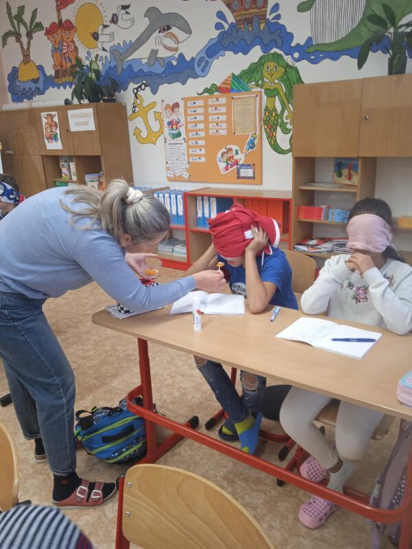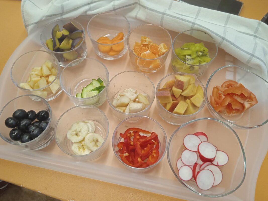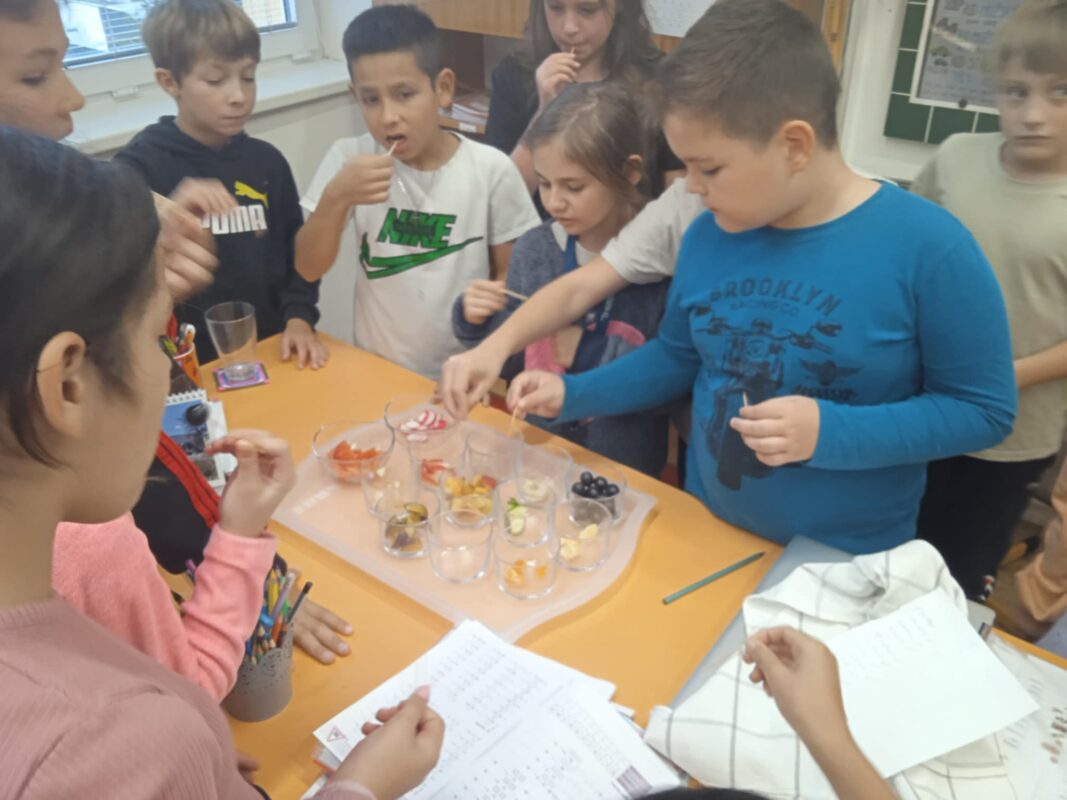 Za vrchol celého tematického bloku děti jednoznačně označily ochutnávku ovoce a zeleniny poslepu. Se zavázanýma očima hádaly, co právě ochutnávají – a to samozřejmě v angličtině! Tato aktivita nejen rozvíjela smyslové vnímání, ale také motivovala děti k aktivnímu používání nové slovní zásoby v praxi.