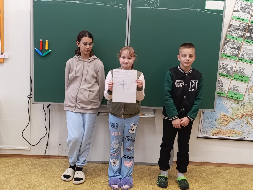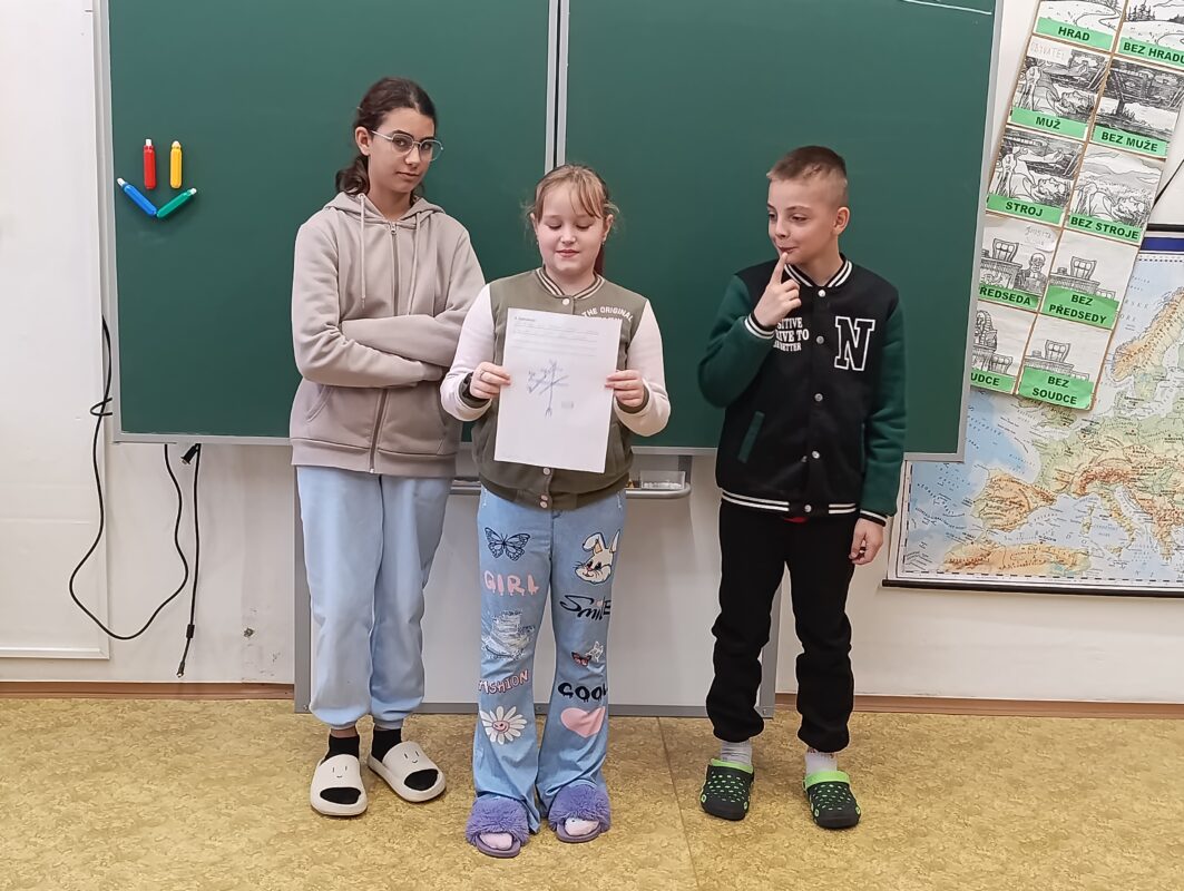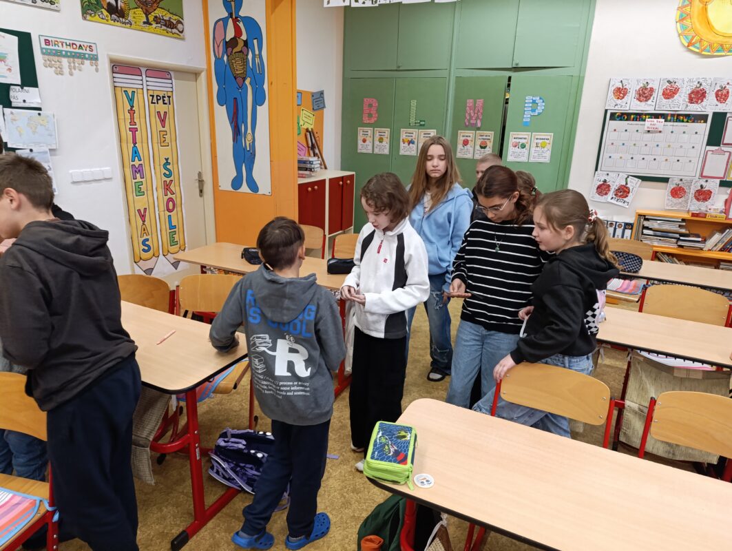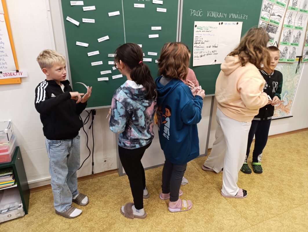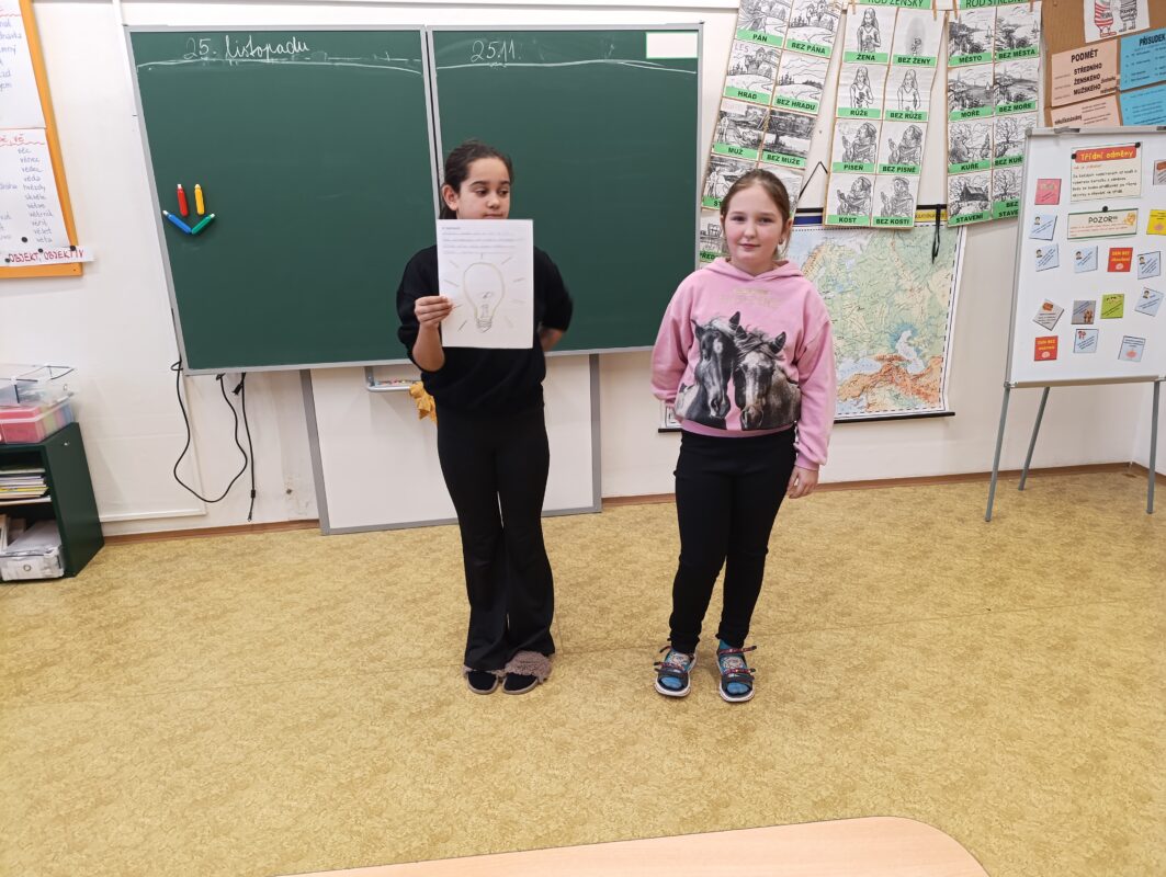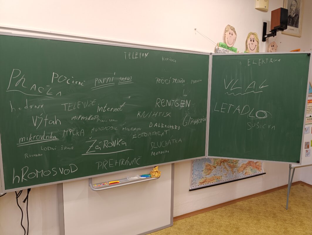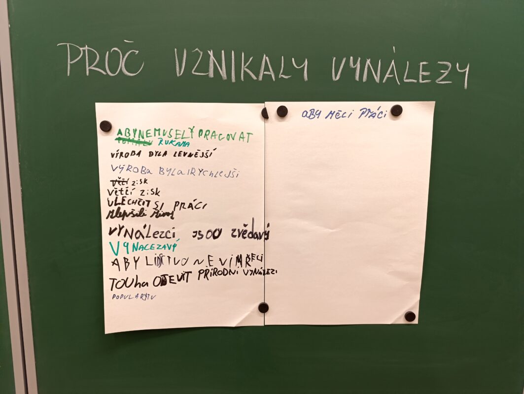 O vynálezy jsme se v 5. třídě zajímali díky tomu, že právě ve vlastivědě probíráme průmyslovou revoluci. A proto jsme se do problematiky ponořili trošku více. Uvažovali jsme , proč se vlastně vynalézalo, jak vynálezy prospěly lidem, třídili jsme vynálezy podle století jejich vzniku, nebo jsme se hlouběji zkoumali oinformace o parním stroji, tkalcovském stavu nebo koněspřežné železnici. Hlavní částí projektu bylo ve trojicích zpracovat informace o jednom vybraném vynálezu, kterých jsme na tabuli před tím vypsali opravdu mnoho. Informace jsme čerpali z knih, encyklopedií, vyhledávali jsme je na internetu i za použití AI. Koneečné výtvory jsme pak odprezentovali ostatním skupinám. Ve volných chvílích jsme pak luštili názvy vynálezů českých vynálezců, nebo jsme si lámali hlavičky na zašifrovaným vzkazem jednoho z nich. Ten byl opravdu zajímavý: