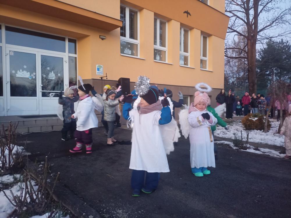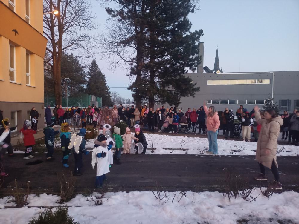 A nejen to. Stejně jako předešlé roky jsme se i tento setkali před budovou školy v hojném počtu, žáci, rodiče, babičky, příbuzní…, za což jsme velice rádi, o to více jsme si slavnostní vánoční atmosféru mohli užít. Krásně nasněžilo, mrzlo – přesně tak, jak to má být.