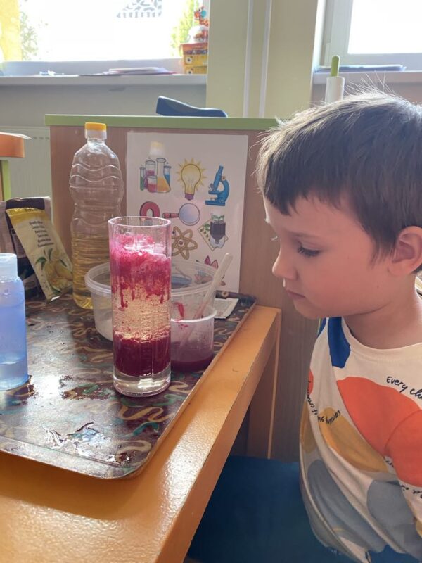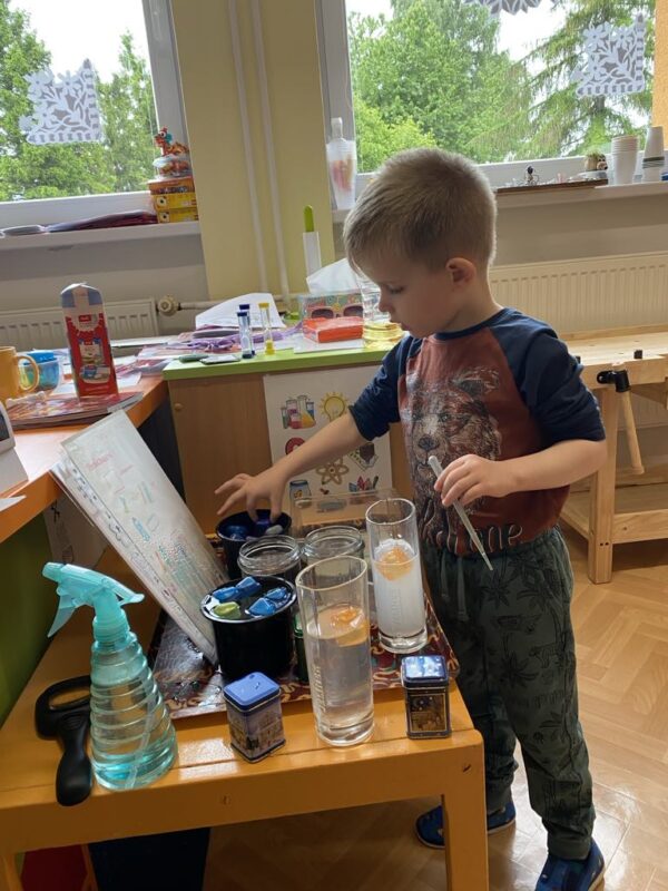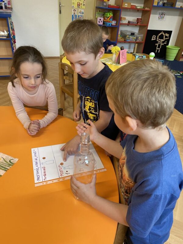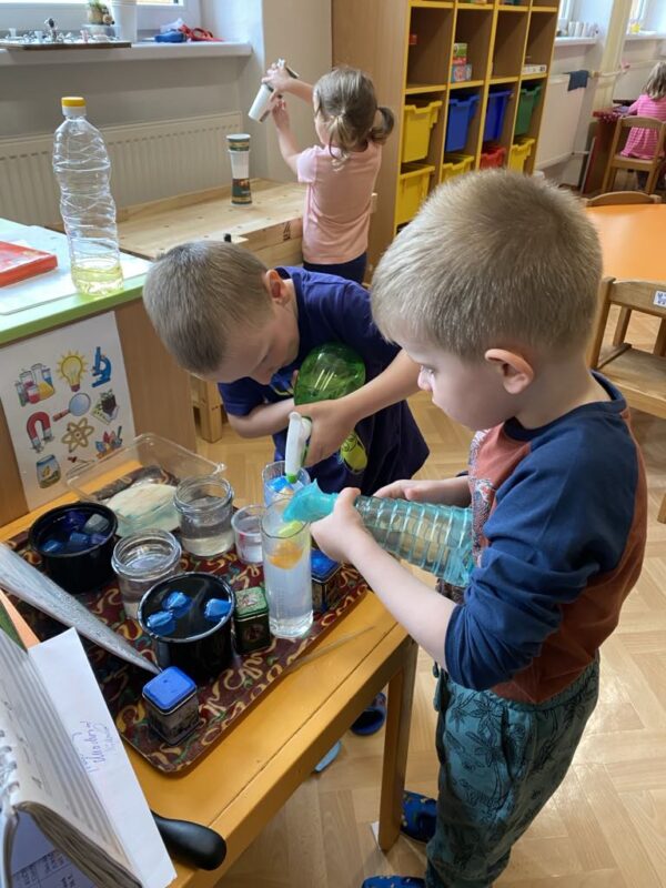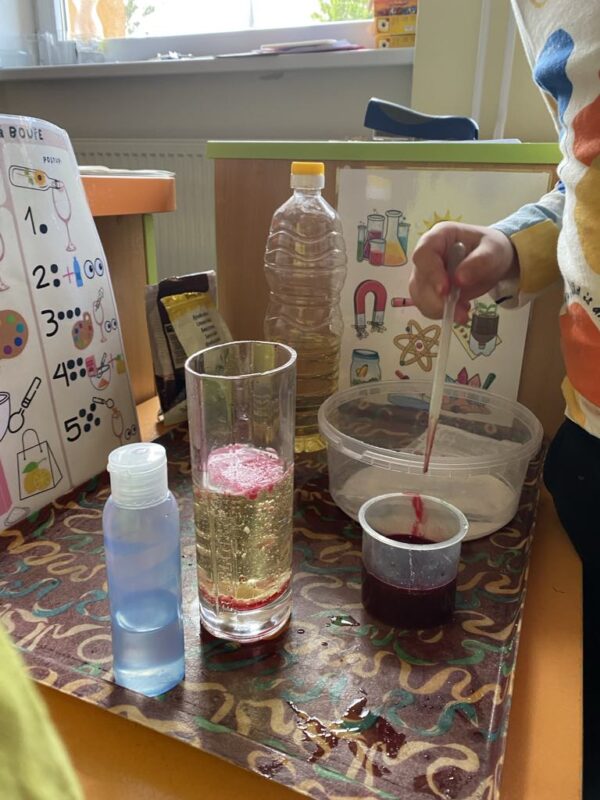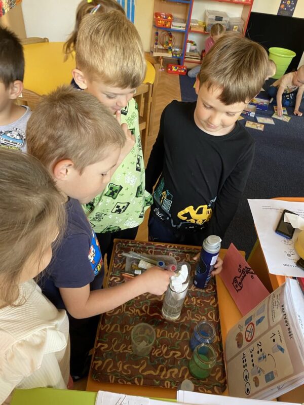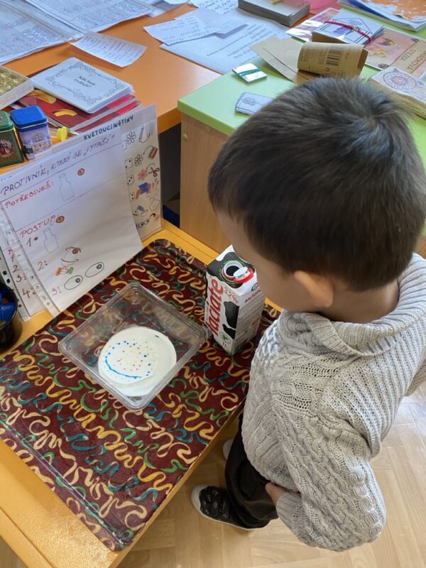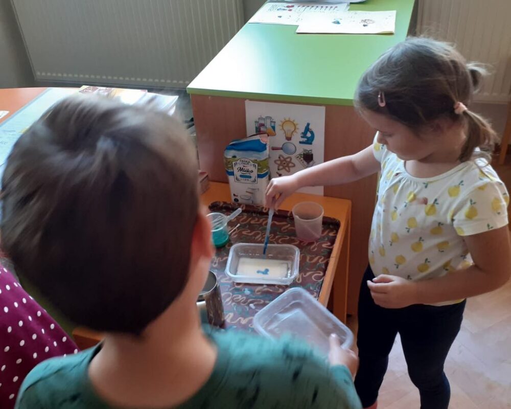 V naší školce se denně snažíme podporovat zvídavost, tvořivost a radost z objevování. Pro děti připravujeme různé experimenty s vodou, barvami, mlékem, olejem …., kde si děti dle barevného obrázkového návodu mohou samy vyzkoušet, co dokáže obyčejná voda nebo mléko, když se spojí s barvami, a jak vzniká zapouštění barev do různých materiálů. Zkoumají hustotu vody, oleje, pozorují odstředivou sílu při vhození mince do láhve a točení s ní, kostky ledu ve vodě a cestování barev ve vodě a mléce, co dokáže udělat slaná voda s rajčetem, a nebo třeba mrak vytvořený z páry horké vody a zapálené sirky. Děti se během aktivit proměnily v malé vědce a výtvarníky zároveň. Pracovaly se štětci, kapátky, vodou, barvami, fixy, solí, mlékem, olejem a savým papírem. Zkrátka poznáváme svět kolem nás!