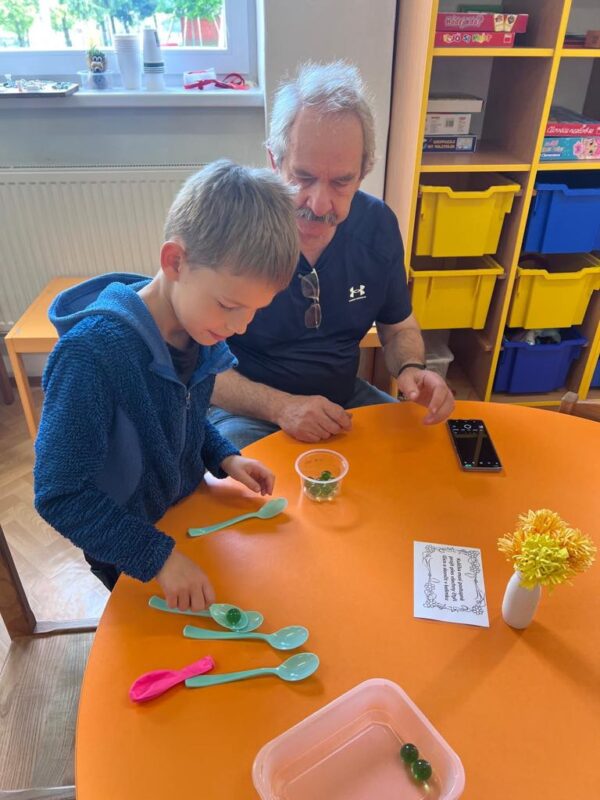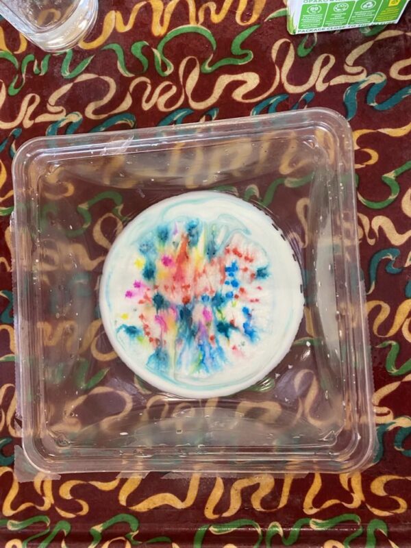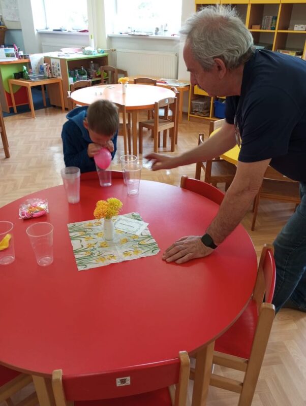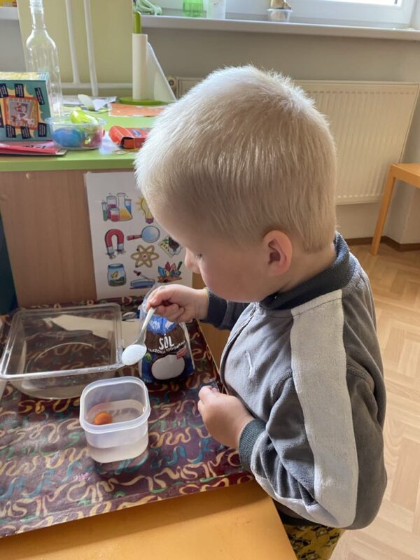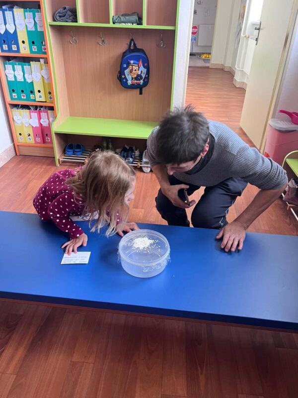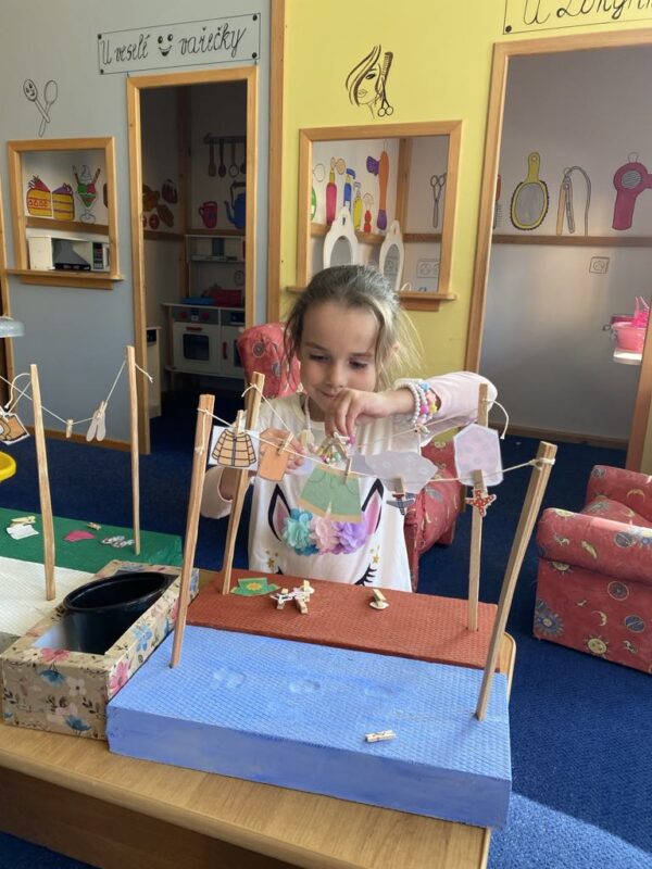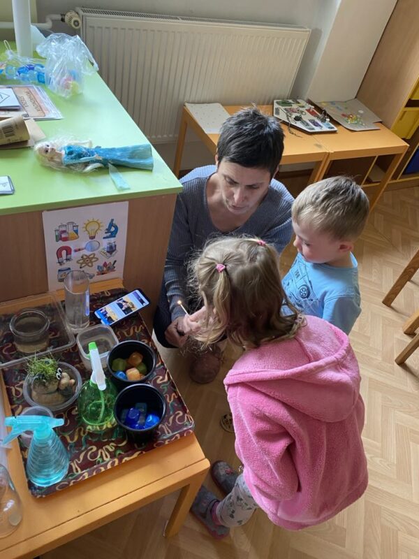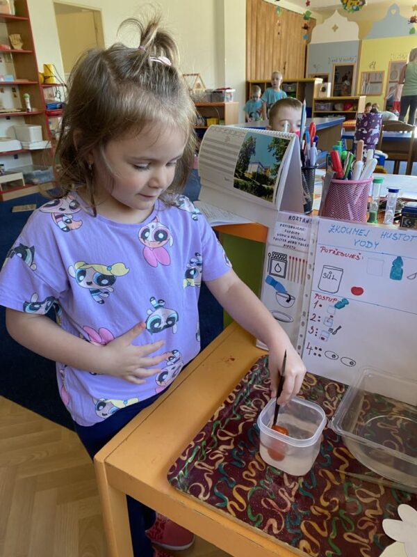 V naší školce se denně snažíme podporovat zvídavost, tvořivost a radost z objevování. Pro děti připravujeme různé experimenty s vodou, barvami, mlékem, olejem …., kde si děti dle barevného obrázkového návodu mohou samy vyzkoušet, co dokáže obyčejná voda nebo mléko, když se spojí s barvami, a jak vzniká zapouštění barev do různých materiálů. Zkoumají hustotu vody, oleje, pozorují odstředivou sílu při vhození mince do láhve a točení s ní, kostky ledu ve vodě a cestování barev ve vodě a mléce, co dokáže udělat slaná voda s rajčetem, a nebo třeba mrak vytvořený z páry horké vody a zapálené sirky. Děti se během aktivit proměnily v malé vědce a výtvarníky zároveň. Pracovaly se štětci, kapátky, vodou, barvami, fixy, solí, mlékem, olejem a savým papírem. Zkrátka poznáváme svět kolem nás!