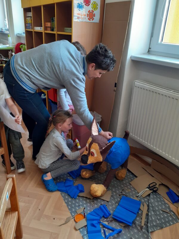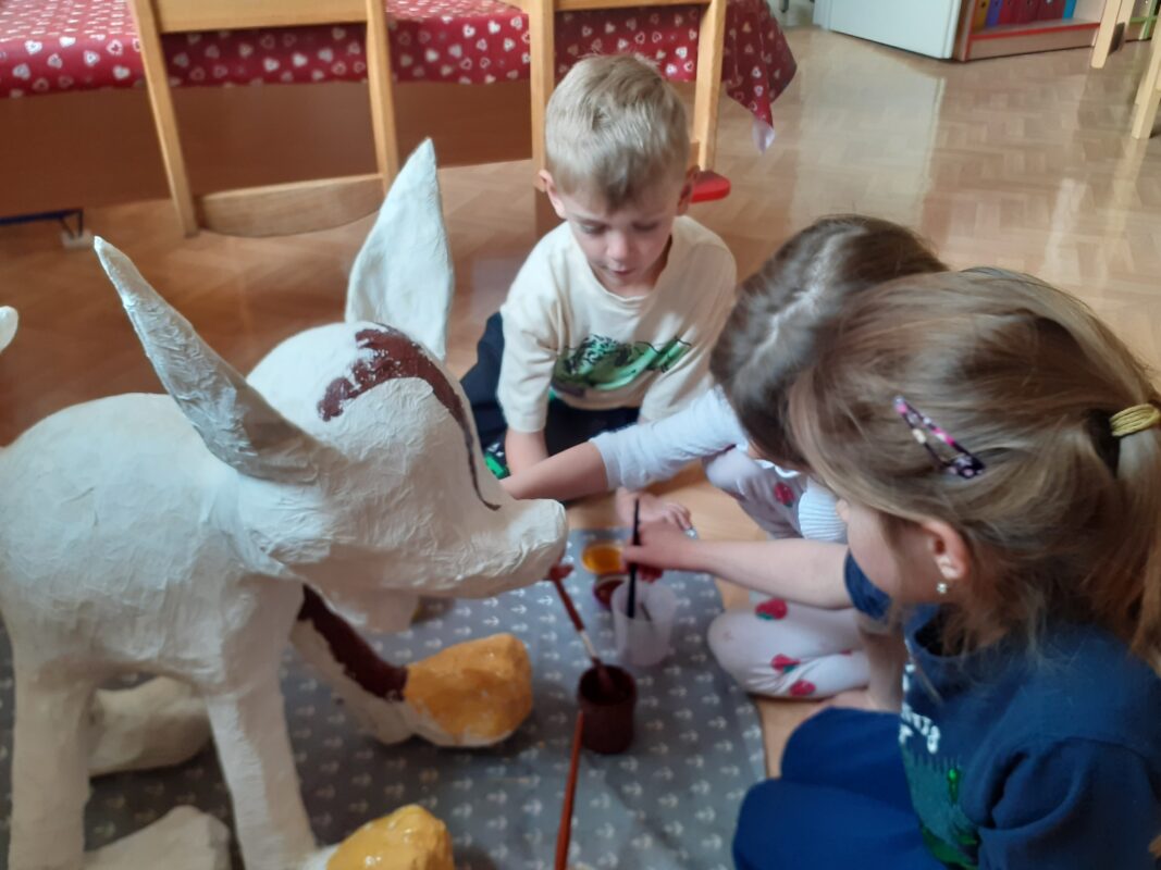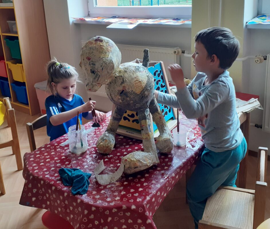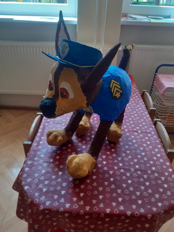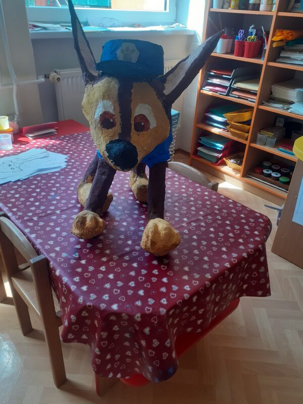 V polovině dubna jsme se s dětmi dali do kašírování pejska, kterého pošleme do soutěže Ministerstva vnitra. Celé dva měsíce se děti průběžně střídaly v trhání novinových proužků, lepení tapetovým lepidlem a následně také v „ošetřování“ našeho hrdiny. Děti neprocvičovaly jen jemnou motoriku a trpělivost, ale především schopnost spolupracovat ve skupině bez vedení paní učitelky. Paní učitelky však musely být nápomocny a „tvarovat“ dětské dílo. Podívejte, jak Jase vznikal 🙂