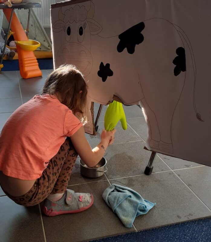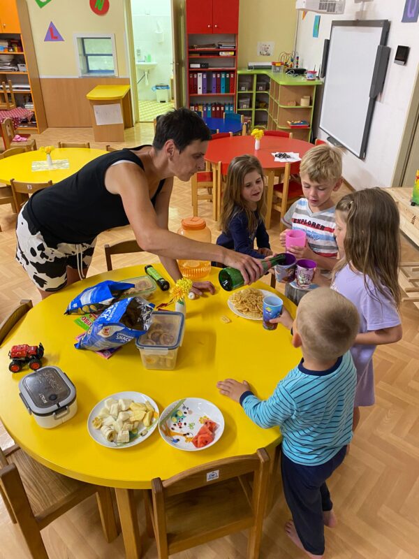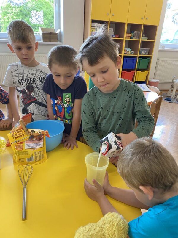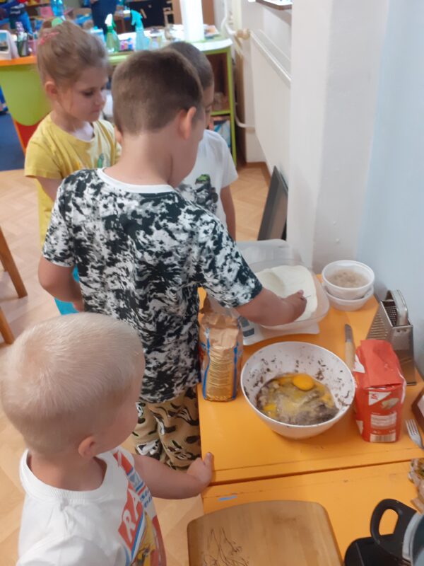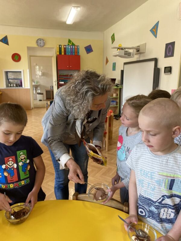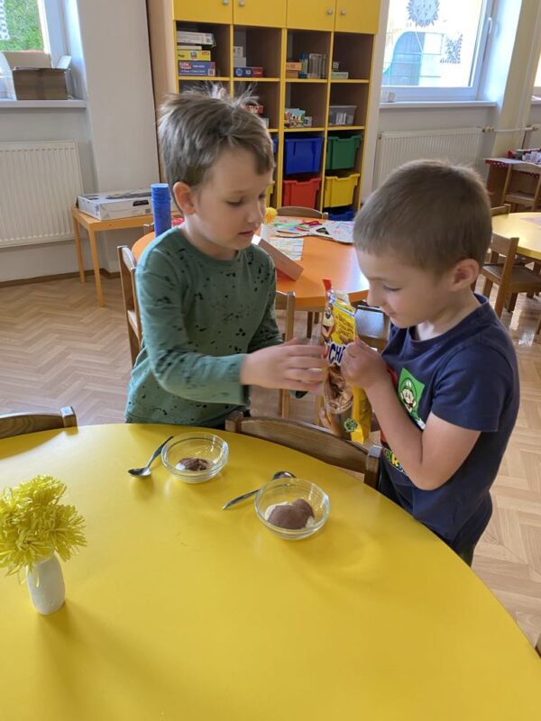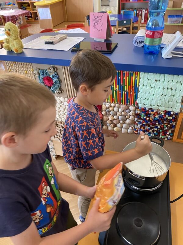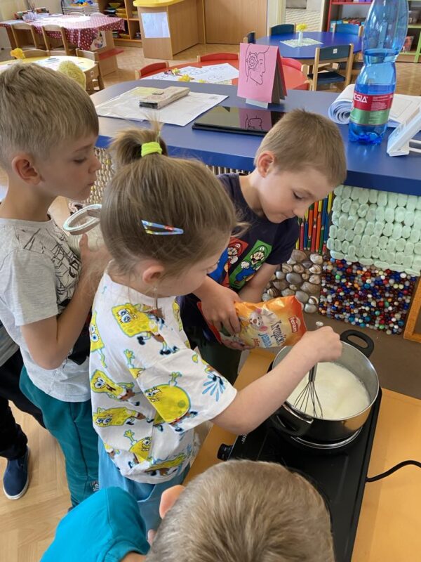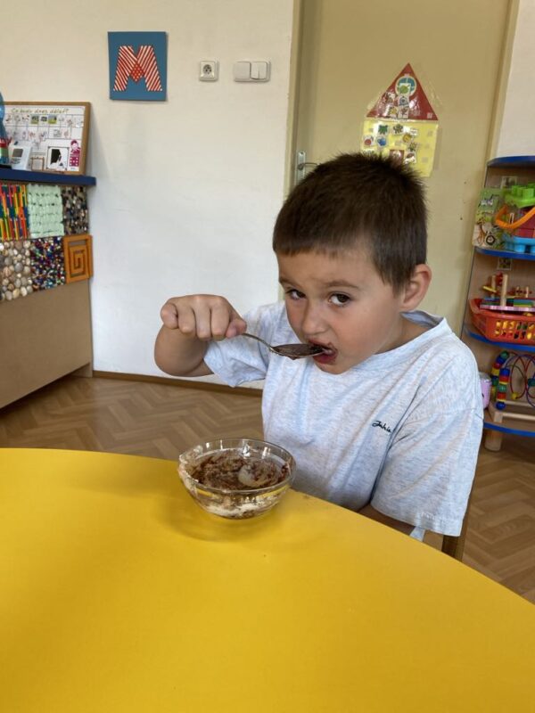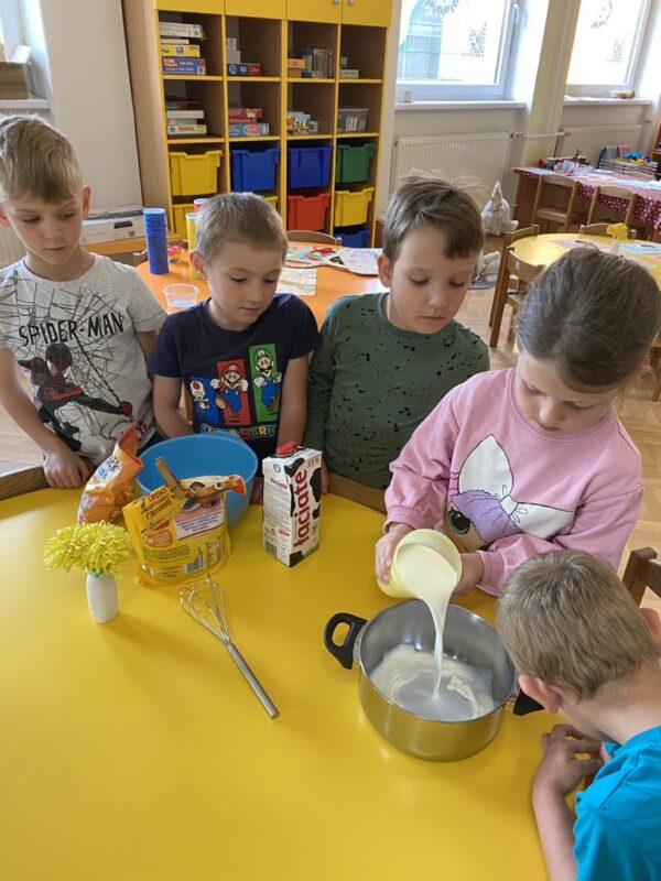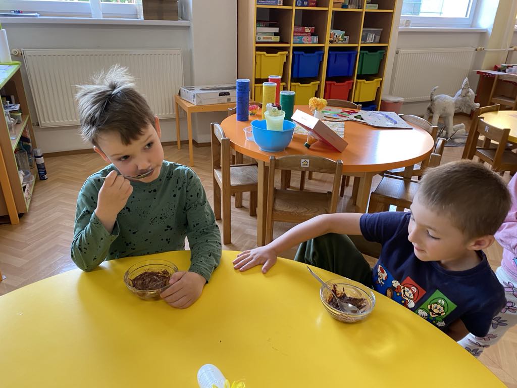 Dnes jsme si ve školce povídali o rodině. Každý vyprávěl, koho má doma – maminku, tatínka, sourozence, a někteří i malé miminko. Pak jsme si hráli na kuchaře a připravovali krupicovou kaši, jako ji vaří maminka doma. Nejprve si děti umyly ruce, pak společně změřily mléko a nasypaly krupici. Míchaly, dokud kaše nezhoustla. Nakonec přidaly cukr a paní ředitelka přisypala každému na přání trošičku slaďoučkého kakaa. Voněla nám po celé třídě! Mňam, to byla dobrota!