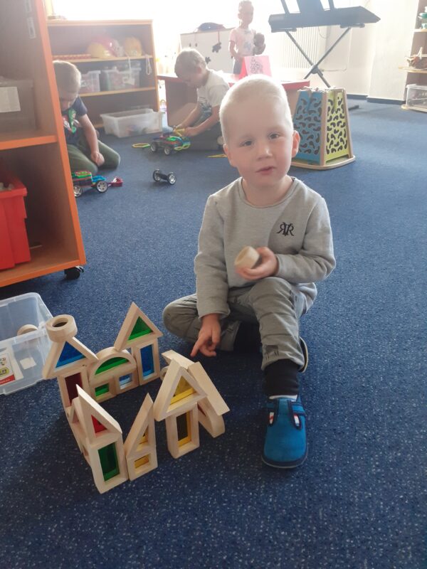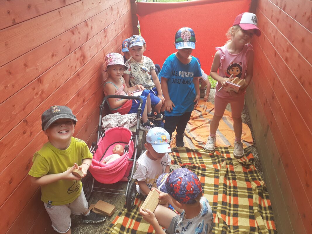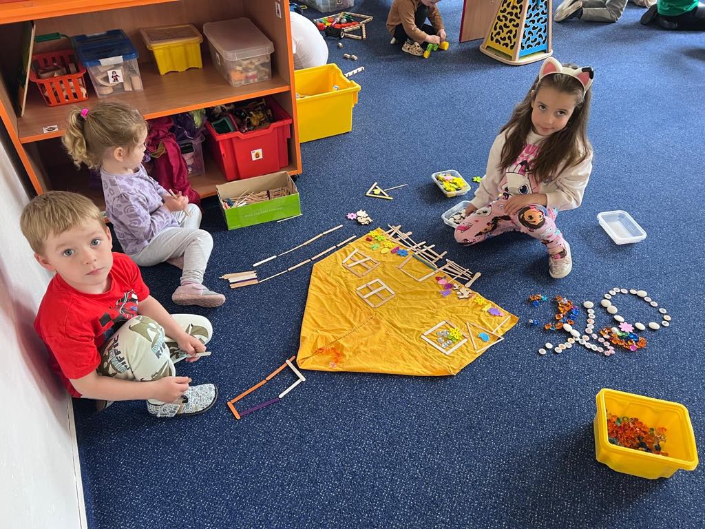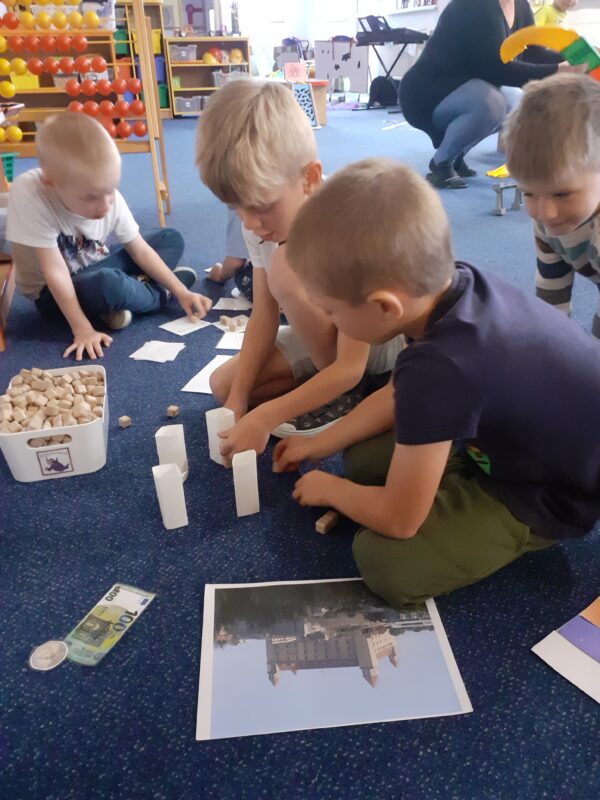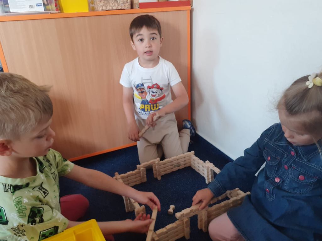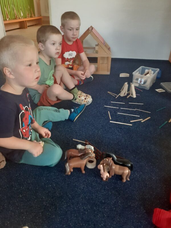 Páteční projektový den byl plný stavění domečků, chaloupek i jiných staveb. Děti si zahrály pohádku Bouda v poli, přemýšlely nad tím, které domovy jsou pro různá zvířátka typická. Vysvětlili jsme si význam pranostiky a seznámili jsme se s legendou o svatém Františkovi. Děti při kresleném čtení doplňovaly slova ve správném gramatickém tvaru a popisovaly, co vidí na obrázku komiksu František a vlk. Hráli jsme si se slovíčky a určovali, zda se dvojice slov rýmují nebo ne. Vymýšleli jsme slova, která znamenají stejnou věc, ale říkají se jinak, přemýšleli jsme, co všechno nám doma dává teplo a světlo. Cílem projektového dne bylo vést děti ke spolupráci a poukázat na to, že když jsme k ostatním milí, nic špatného se nám nemůže dít :-). Děti si zahrály také na pohádku O třech prasátkách a venku v teepee stavěly jejich domky.