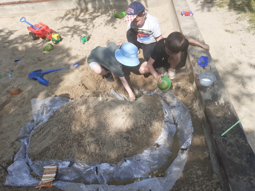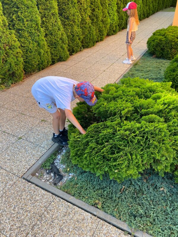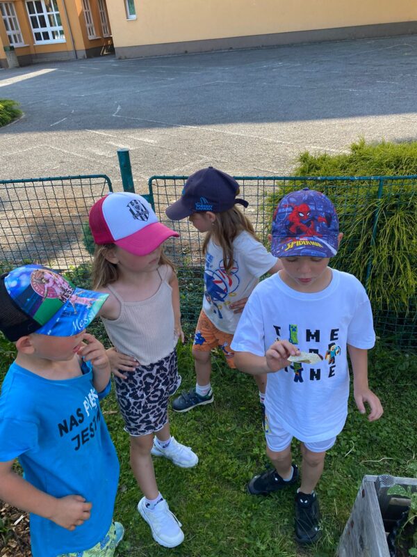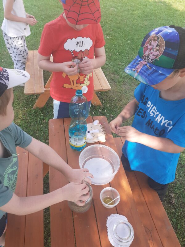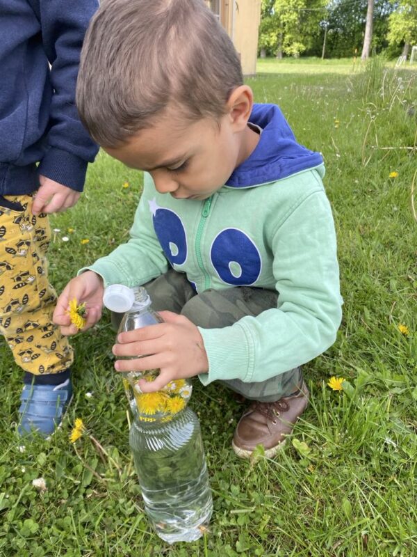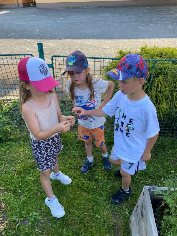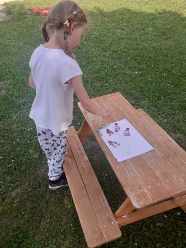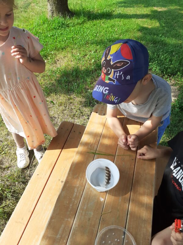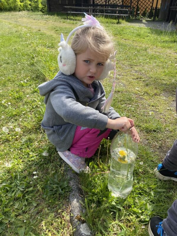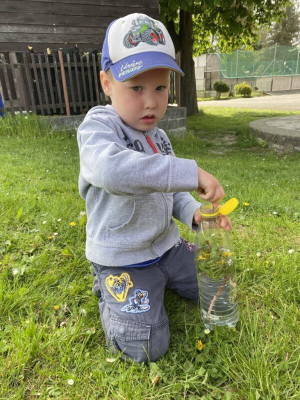V průběhu dvou týdnů se děti staraly o našeho „travňáka“, seznamovaly se s názvy některých kytiček na louce, sbíraly pampelišky (, ze kterých si také uvařily a ochutnaly sirup), seznamovaly se s drobnými živočichy v půdě, nebo třeba zkusily založit žížalárium. Po dlouhodobém pozorování klíčících a pučících žaludů jsme v blízkém lesíku, kam často vyrážíme, zasadili už „vzrostlé“ duby :-). Děti se seznamovaly s názvy zvířat i způsobem jejich života, naslouchaly zpěvu ptáků, samy zpívaly, tvořily z dekoračních i výtvarných materiálů. Počasí nám přálo, a tak většina aktivit se uskutečnila venku.