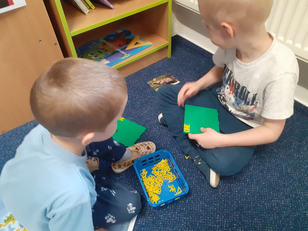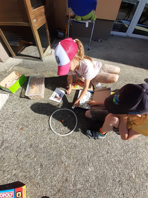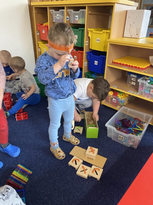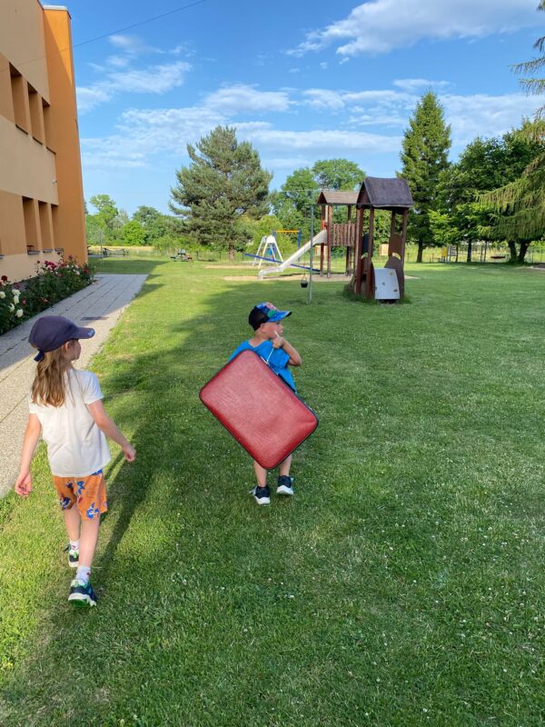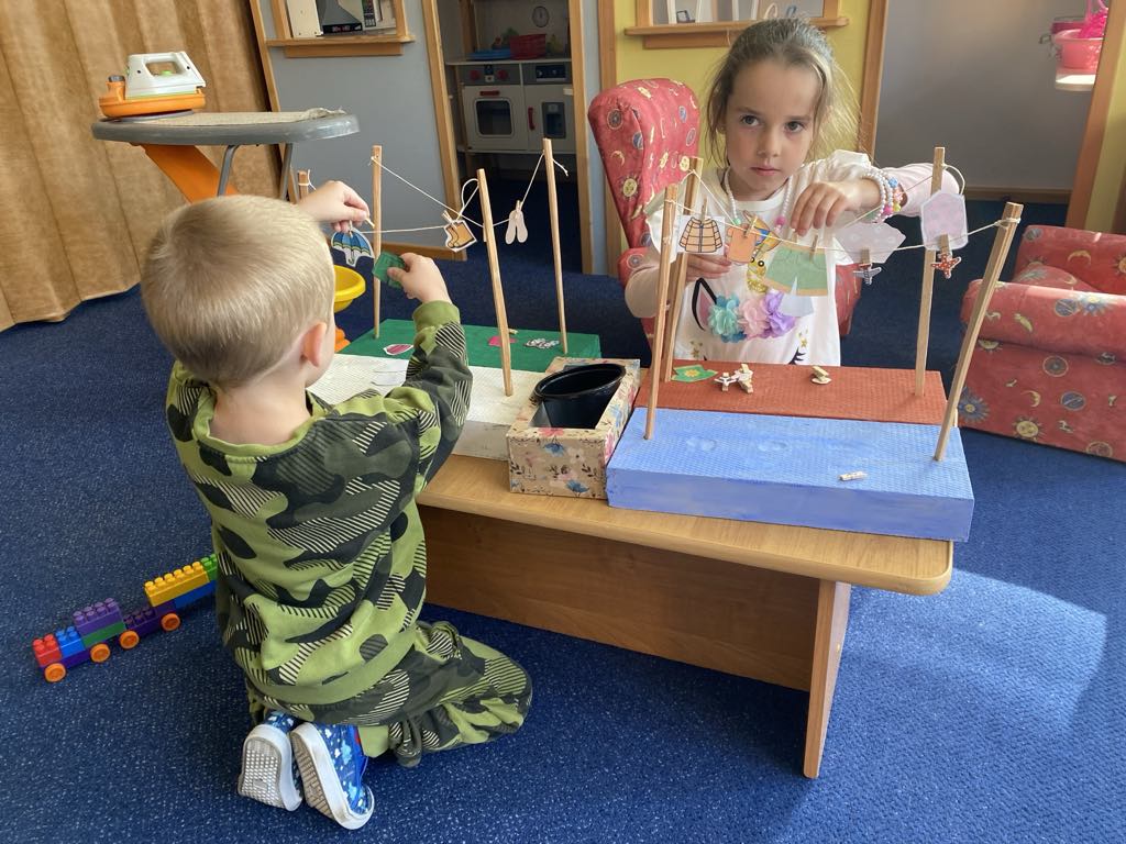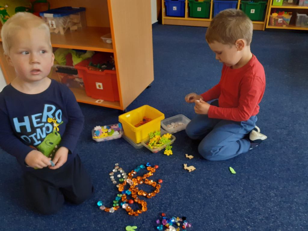 K tématu jsme použili „starý“ kufr Dřeska (dřevo, sklo, kov) a Tilpíny (textil, papír, hlína). Děti se seznámily s příběhem dvou kamarádů a každý den byl věnován některému z materiálů. Děti se učily nejen třídit materiály a zjišťovat jejich vlastnosti, ale především byla upevňována pravidla aktivit a činností v jednotlivých centrech. Děti každý den v kufříku objevily pomůcky k aktivitám a určovaly, do kterého centra by činnosti zařadily. Snažily se také vymyslet samostatně úkol pro své kamarády. Děti skládaly obrazce z dřívek i šátků, dozdobovaly dekoračními materiály, porovnávaly tíhu různých materiálů a zjišťovaly, zda se potopí nebo poplavou. Ve třídě i na zahradě děti hledaly kovové předměty pomocí velikého magnetu. Půjčili jsme si také dřevěné bonbony z MŠ Vysoká k rozvíjení zrakového vnímání, postřehu a upevňování základních barviček. Moc děkujeme, kamarádi.