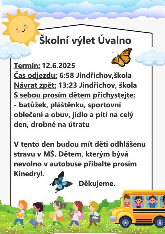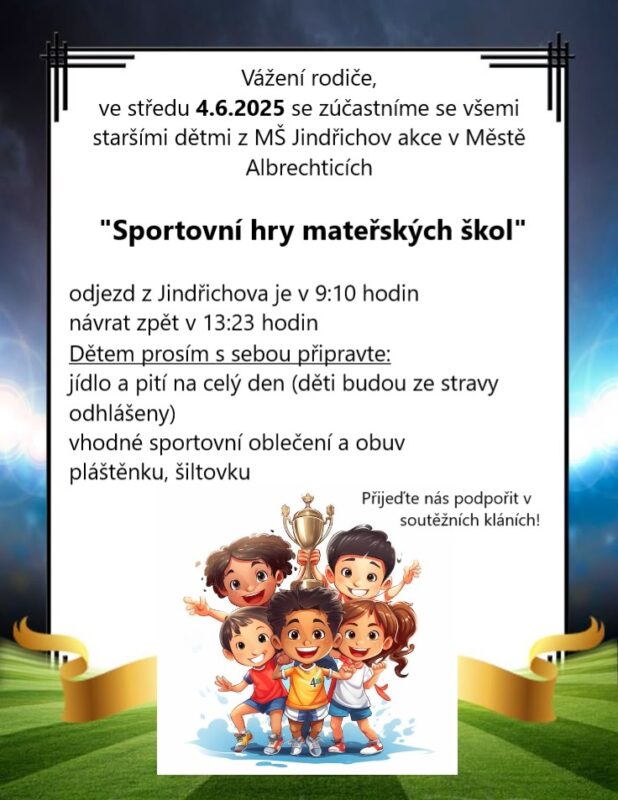 Sdělujeme všem rodičům vybraných dětí, které jedou do Města Albrechtic dne 4.6.2025, že odjíždíme z Jindřichova již v 8:27 hodin ze železniční stanice Jindřichov!