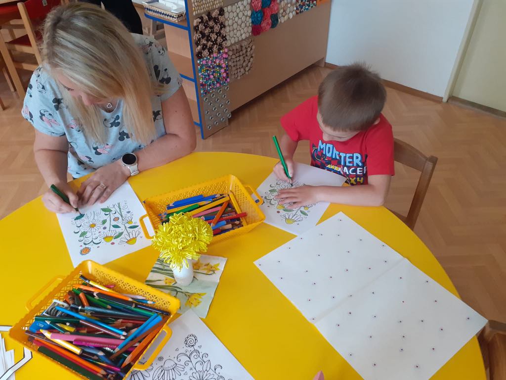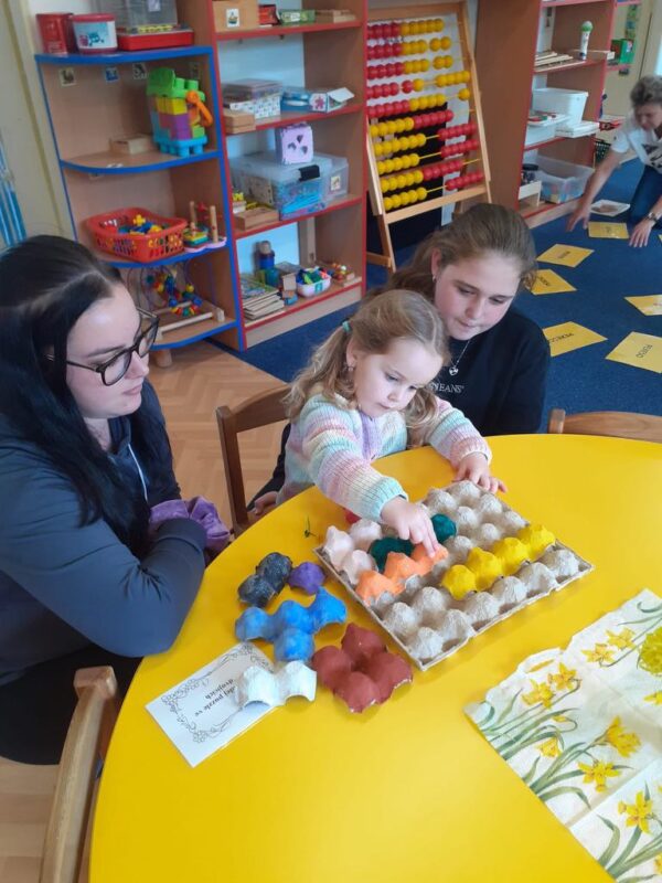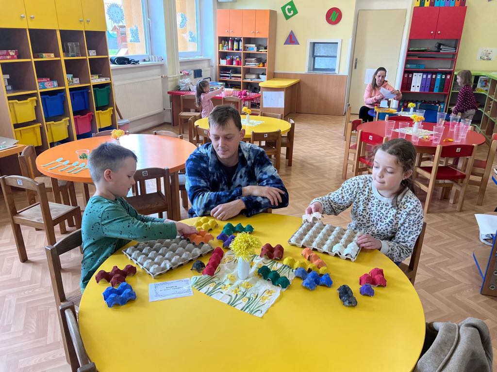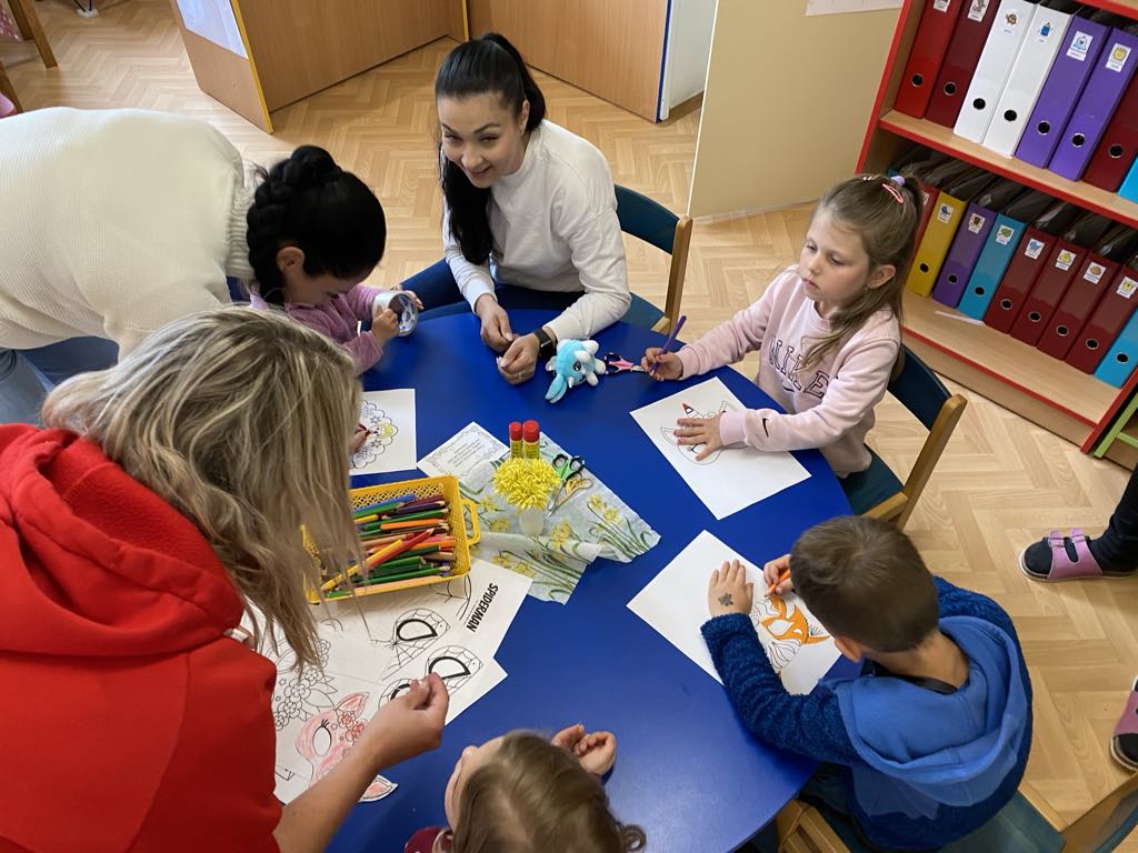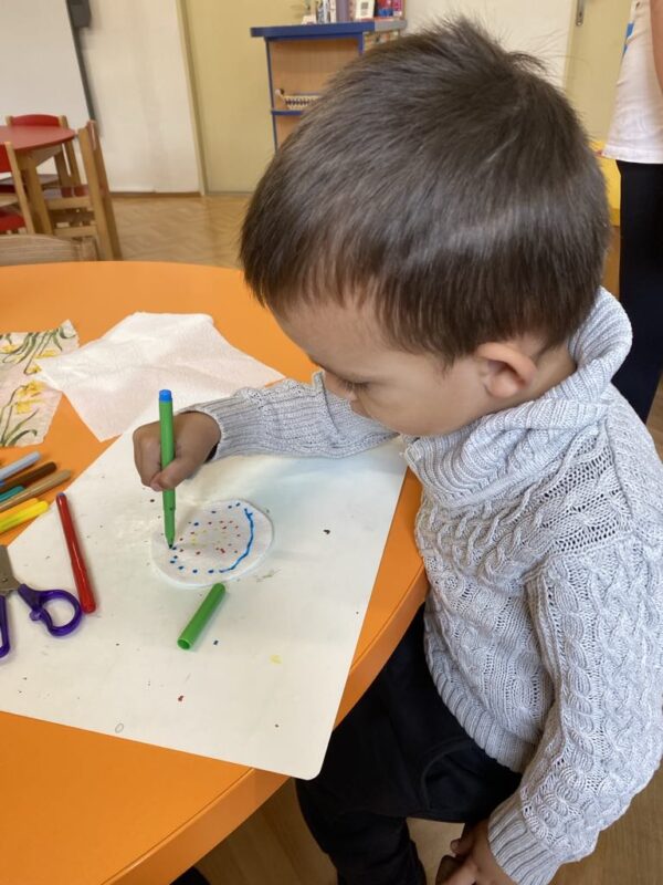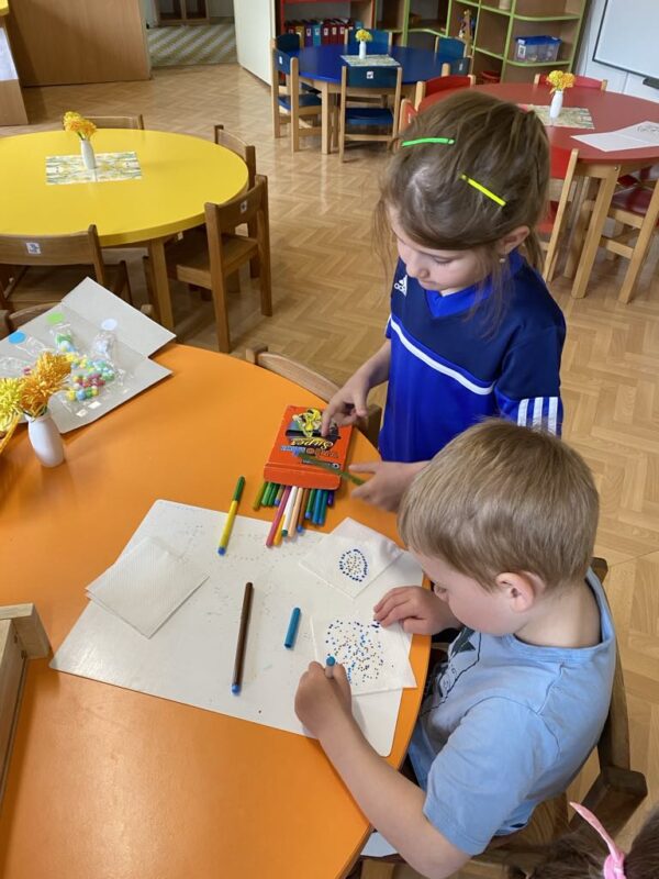 Barvy, nůžky, pastelky, kytičky a další ozdobný materiál nemohl chybět na velikonočním tvoření, kde si děti vyzkoušely různé způsoby zdobení vajíček, vyrobily si krásnou obrovskou kraslici a nezapomněly ani na velikonočního zajíčka. Věříme, že tvoření děti inspirovalo k tomu, aby si společně s rodiči zkusili vytvořit krásné ozdoby i doma, a děvčata k přichystání velikonočních kraslic pro koledníky!