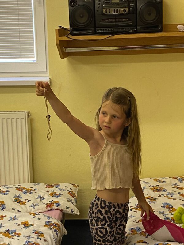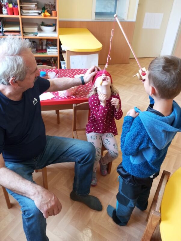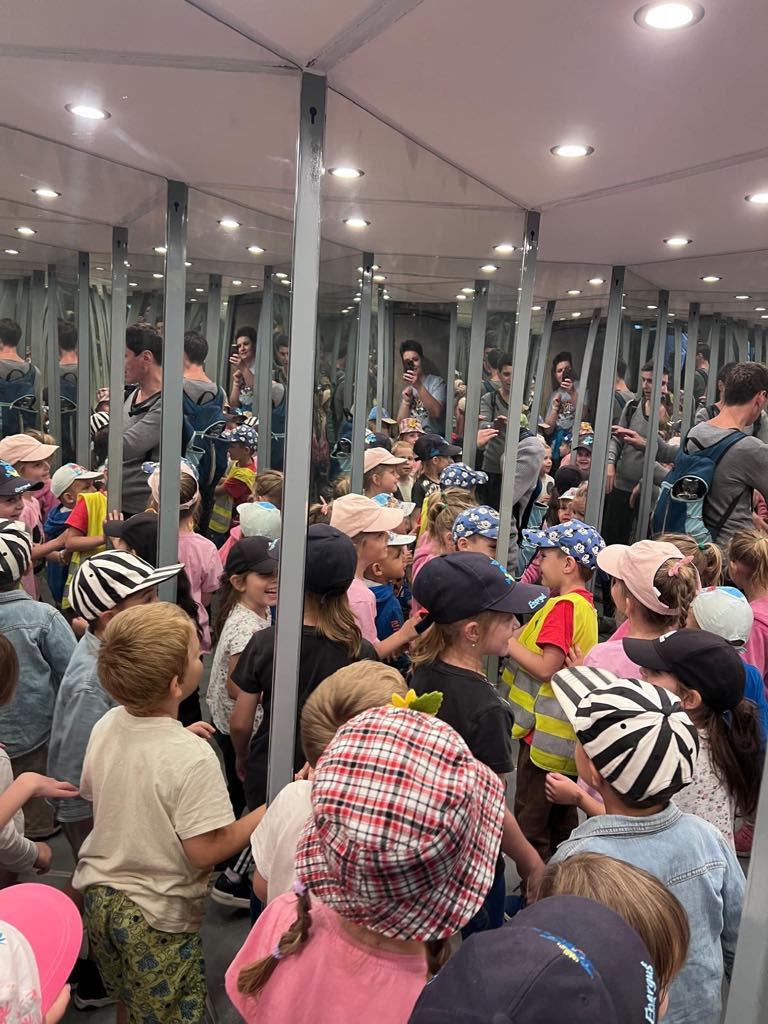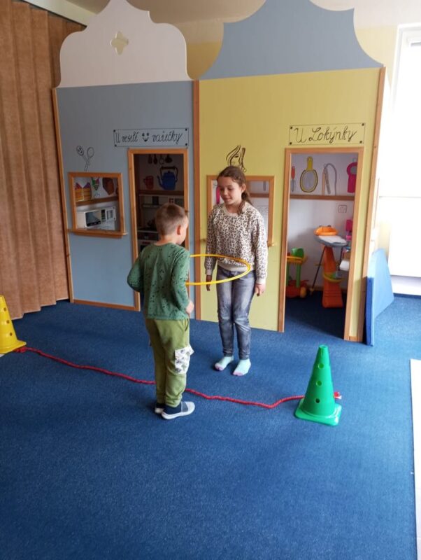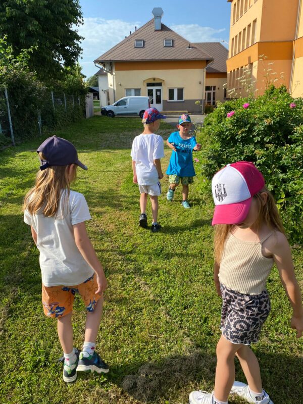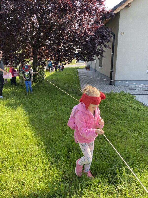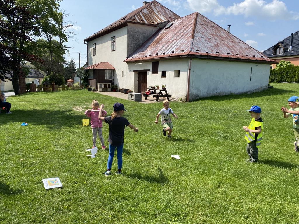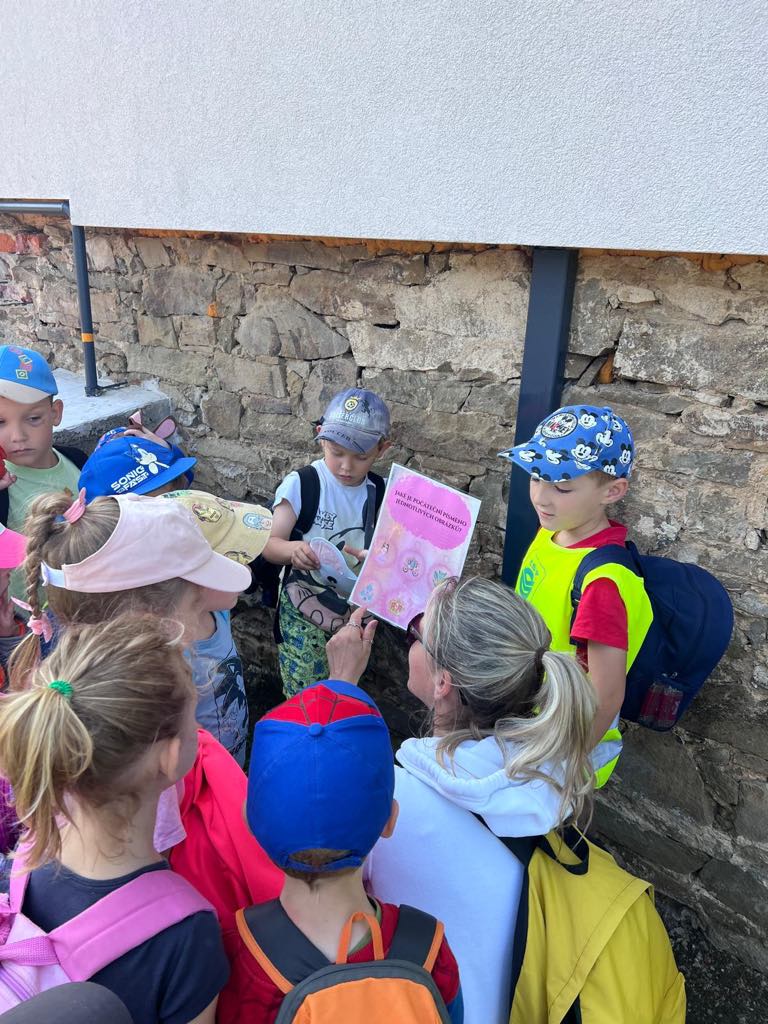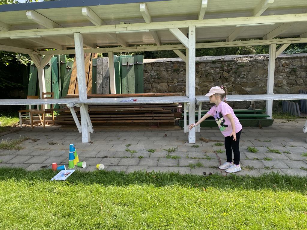 Největší zážitek však přišel ve chvíli, kdy jsme vstoupili do zrcadlového labyrintu – a to ne jen tak obyčejně! Vchod vedl přes starou skříň, jako by nás přímo pozvala Narnie. Děti se smíchem hledaly cestu ven mezi bludištěm zrcadel. Byla to velká zábava a pro mnohé to byl zcela nový zážitek. Cestou na Rychtu se děti zapojily do pohádkové stezky, která byla plná úkolů inspirovaných známými pohádkami. Děti si zahrály „obří“ pexeso, kde si procvičily paměť a názvy pohádkových postav, vyzkoušely experiment – Hrnečku, vař, hledaly cestu se zavázanýma očima, hrály si se slizem, lovily rybičky, tancovaly a vyzkoušely různé pohybové hry.