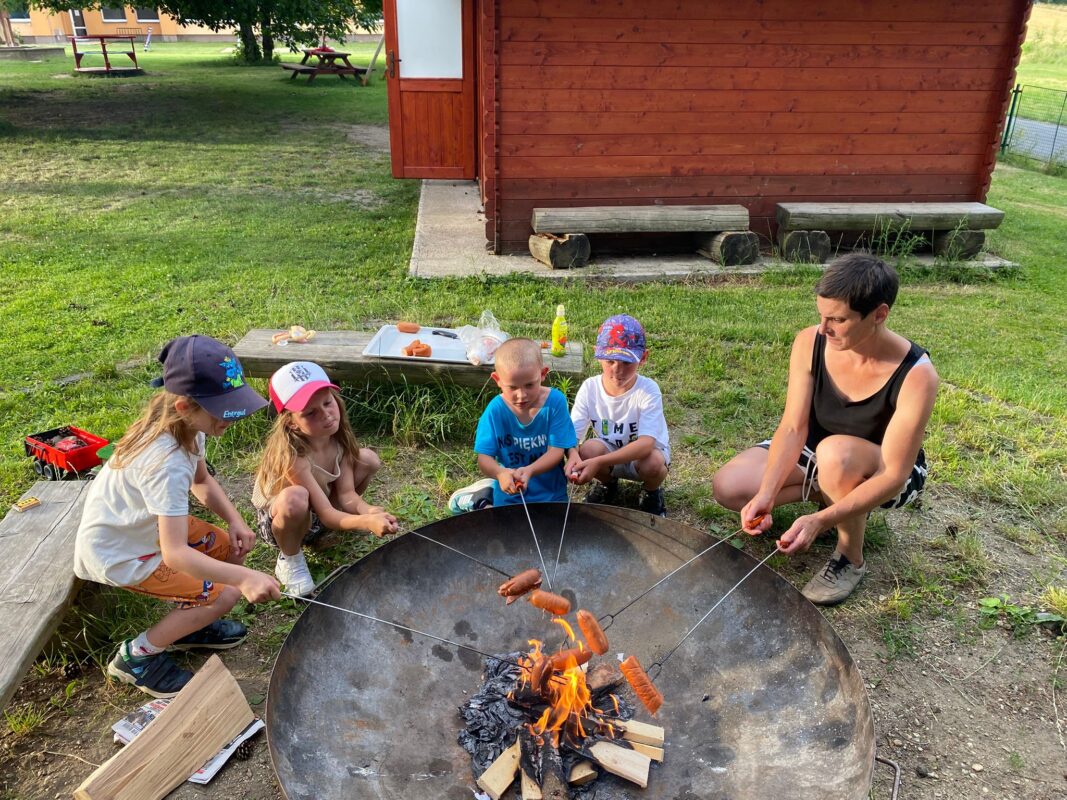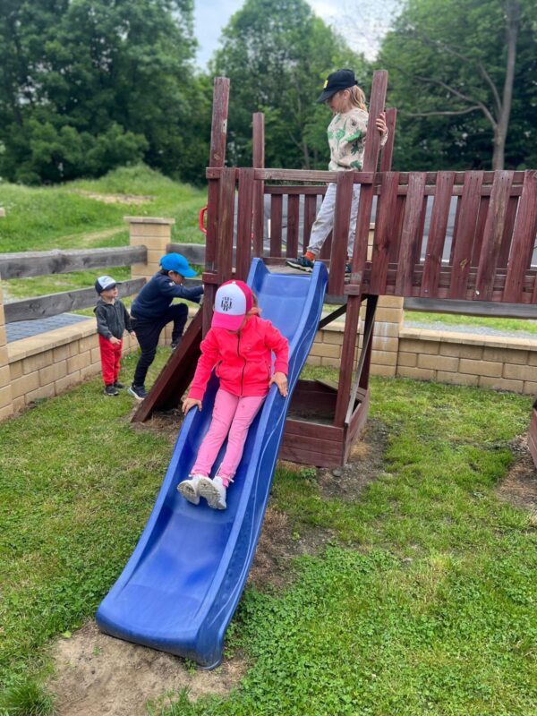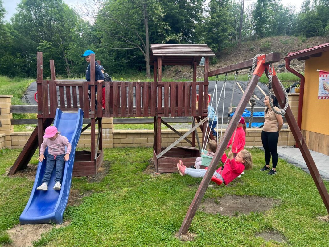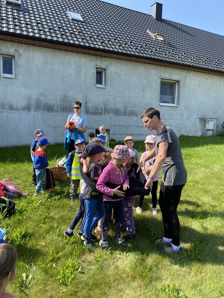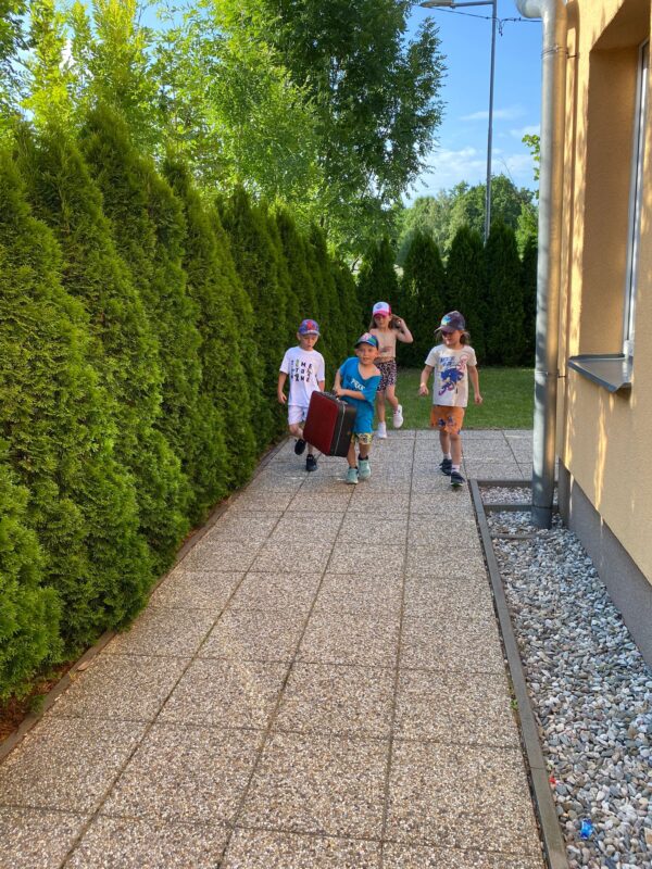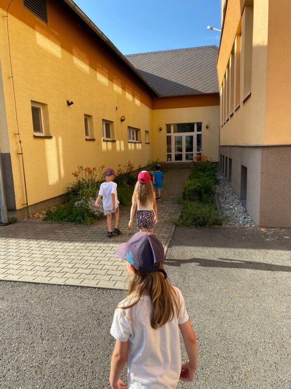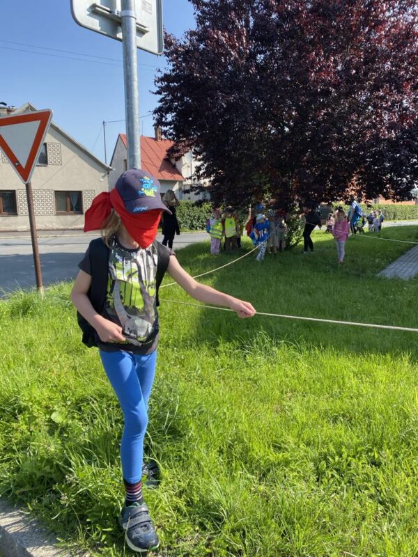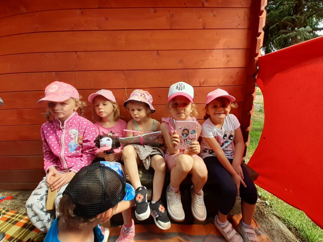 Největší zážitek však přišel ve chvíli, kdy jsme vstoupili do zrcadlového labyrintu – a to ne jen tak obyčejně! Vchod vedl přes starou skříň, jako by nás přímo pozvala Narnie. Děti se smíchem hledaly cestu ven mezi bludištěm zrcadel. Byla to velká zábava a pro mnohé to byl zcela nový zážitek. Cestou na Rychtu se děti zapojily do pohádkové stezky, která byla plná úkolů inspirovaných známými pohádkami. Děti si zahrály „obří“ pexeso, kde si procvičily paměť a názvy pohádkových postav, vyzkoušely experiment – Hrnečku, vař, hledaly cestu se zavázanýma očima, hrály si se slizem, lovily rybičky, tancovaly a vyzkoušely různé pohybové hry.