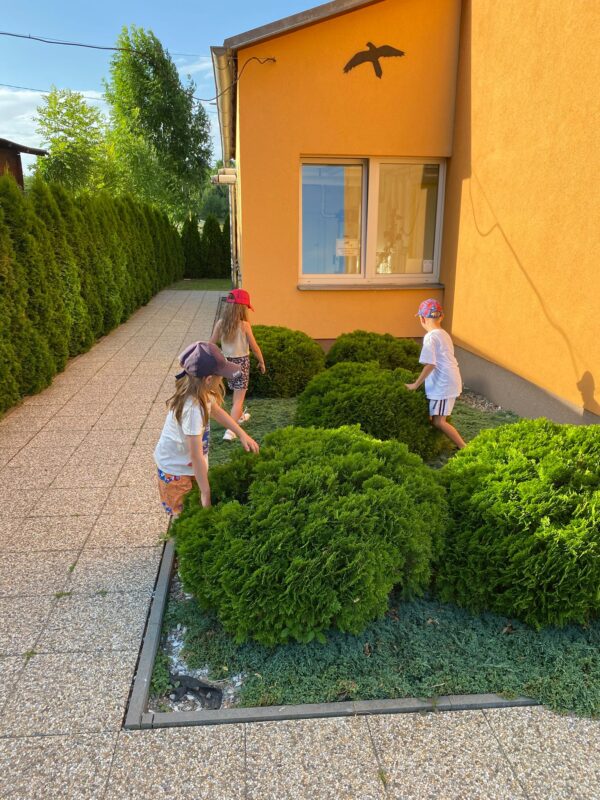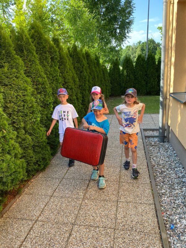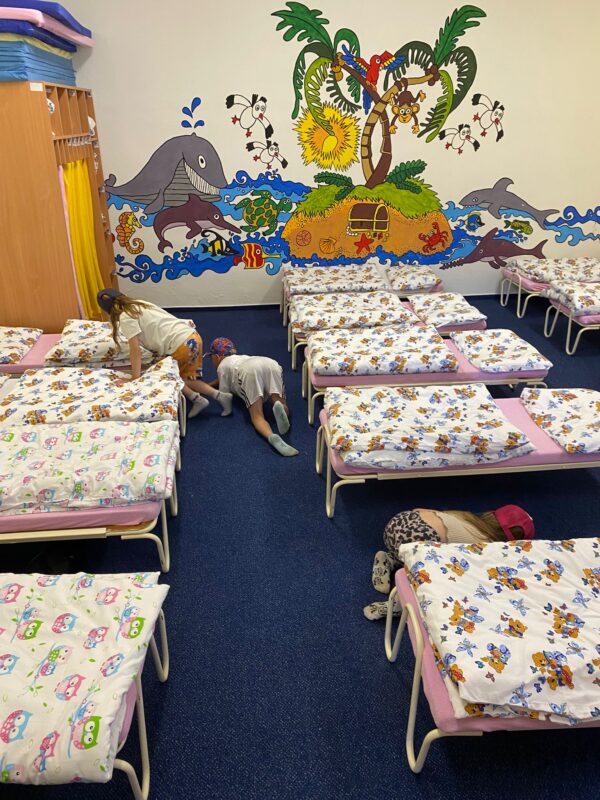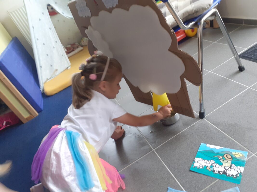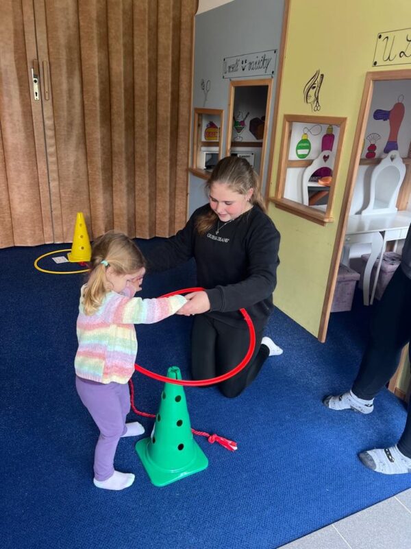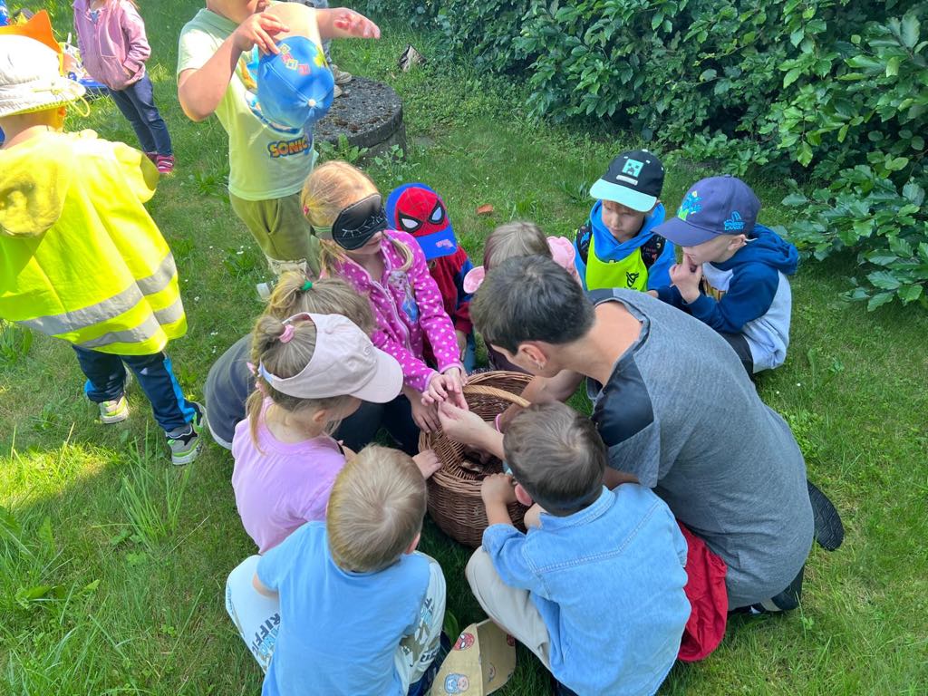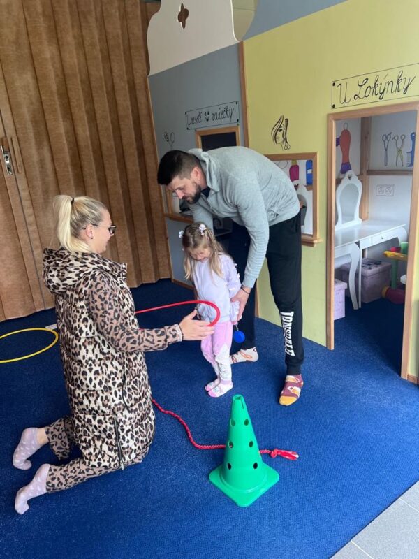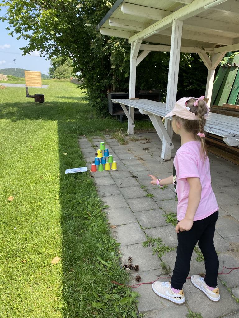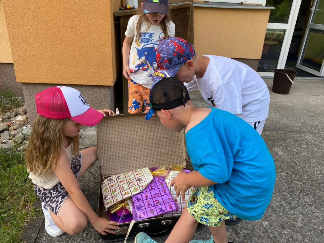 Největší zážitek však přišel ve chvíli, kdy jsme vstoupili do zrcadlového labyrintu – a to ne jen tak obyčejně! Vchod vedl přes starou skříň, jako by nás přímo pozvala Narnie. Děti se smíchem hledaly cestu ven mezi bludištěm zrcadel. Byla to velká zábava a pro mnohé to byl zcela nový zážitek. Cestou na Rychtu se děti zapojily do pohádkové stezky, která byla plná úkolů inspirovaných známými pohádkami. Děti si zahrály „obří“ pexeso, kde si procvičily paměť a názvy pohádkových postav, vyzkoušely experiment – Hrnečku, vař, hledaly cestu se zavázanýma očima, hrály si se slizem, lovily rybičky, tancovaly a vyzkoušely různé pohybové hry.
