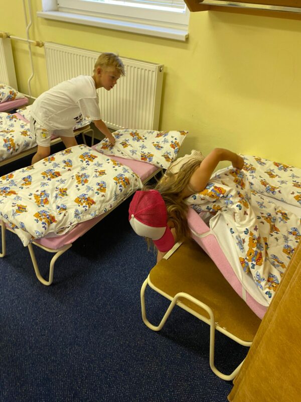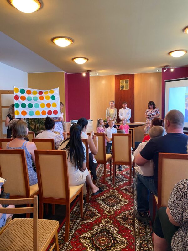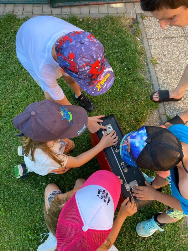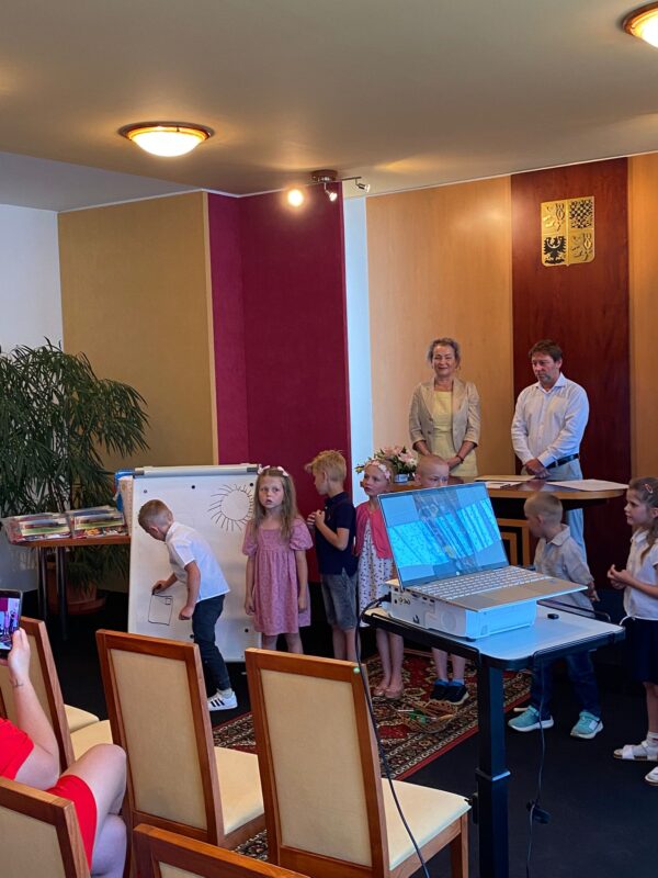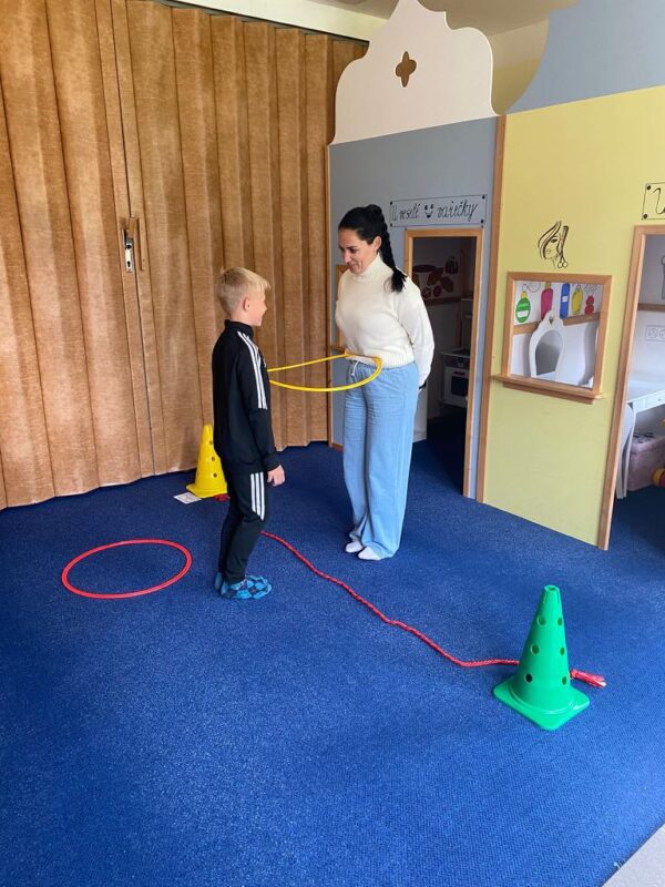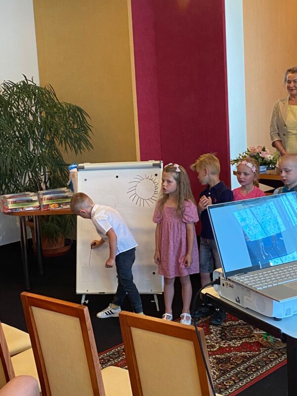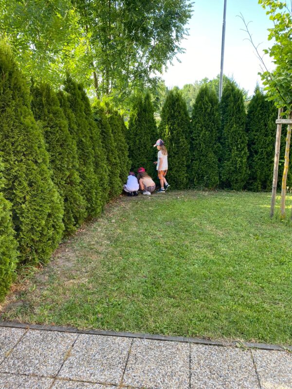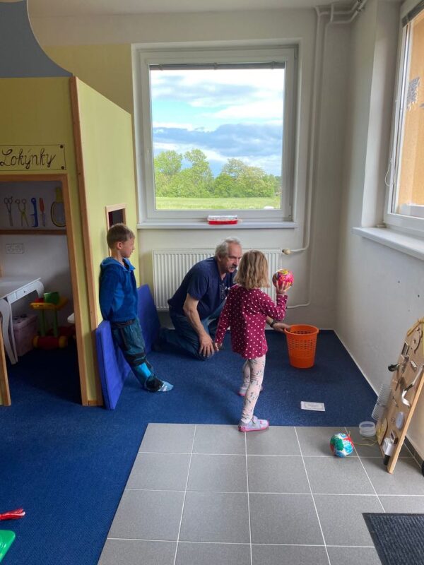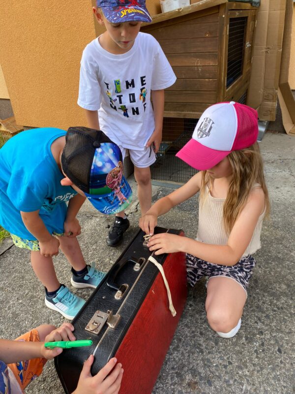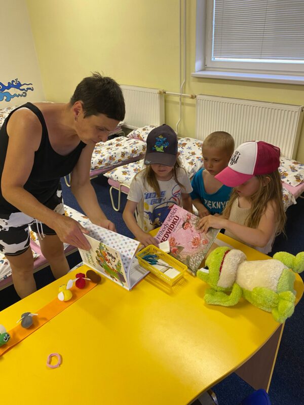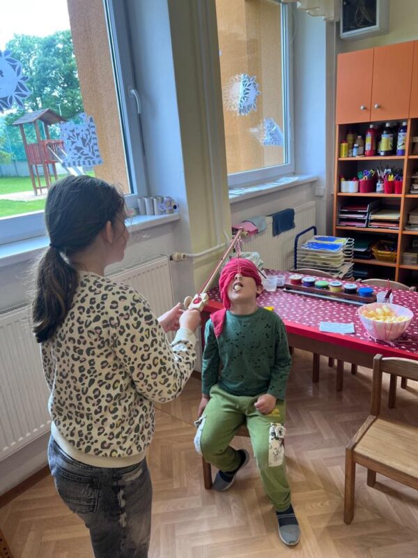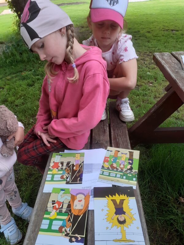 Největší zážitek však přišel ve chvíli, kdy jsme vstoupili do zrcadlového labyrintu – a to ne jen tak obyčejně! Vchod vedl přes starou skříň, jako by nás přímo pozvala Narnie. Děti se smíchem hledaly cestu ven mezi bludištěm zrcadel. Byla to velká zábava a pro mnohé to byl zcela nový zážitek. Cestou na Rychtu se děti zapojily do pohádkové stezky, která byla plná úkolů inspirovaných známými pohádkami. Děti si zahrály „obří“ pexeso, kde si procvičily paměť a názvy pohádkových postav, vyzkoušely experiment – Hrnečku, vař, hledaly cestu se zavázanýma očima, hrály si se slizem, lovily rybičky, tancovaly a vyzkoušely různé pohybové hry.