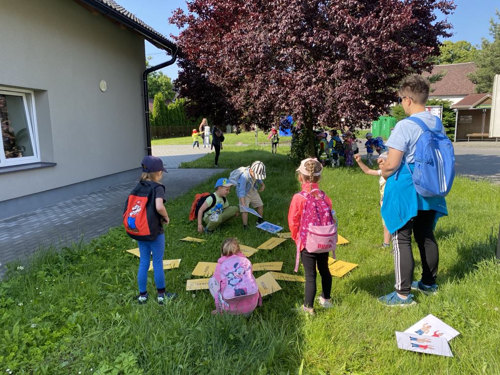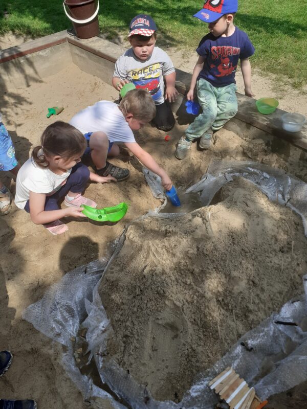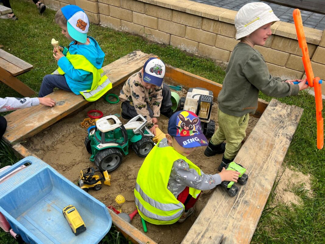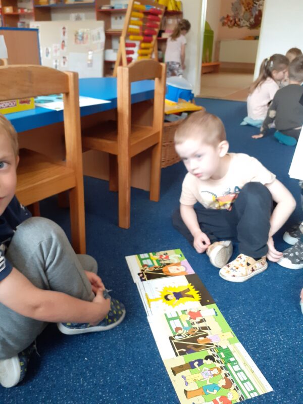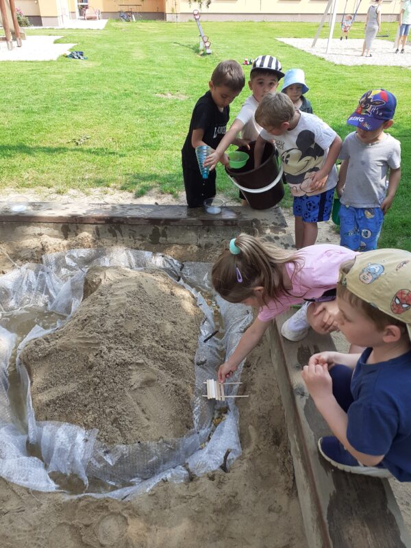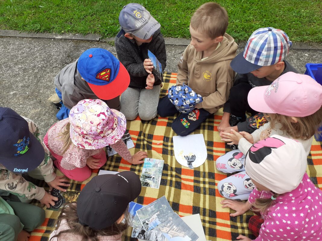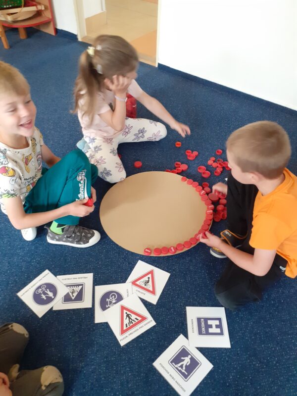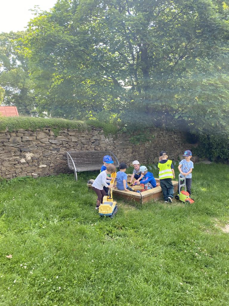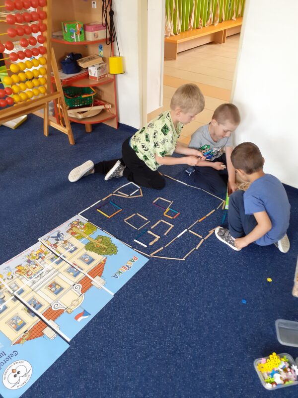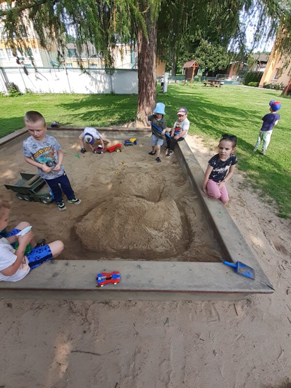 V posledních dvou týdnech se děti seznamovaly s různými dopravními prostředky. Jak se cestuje vlakem i autobusem si vyzkoušely „na vlastní kůži“ a nad obrázky přemýšlely, jaké nebezpečí nás může kolem nás potkat. Seznamovali jsme se s naší vesnicí, hledali jsme rozdíly mezi vesnicí a městem, stavěli jsme domy, silnice a skládali erb Jindřichova. Při cestování na výlety si děti všímaly, že každá vesnice má ve svém znaku něco jiného. Počasí nám přeje a jsme často venku již od ranních hodin. V písku jsem si postavili „vodní dílo“ a pouštěli jsme loďky, seznamovali jsme se s některými dopravními značkami a hráli si Na semafor i Na barevná auta.