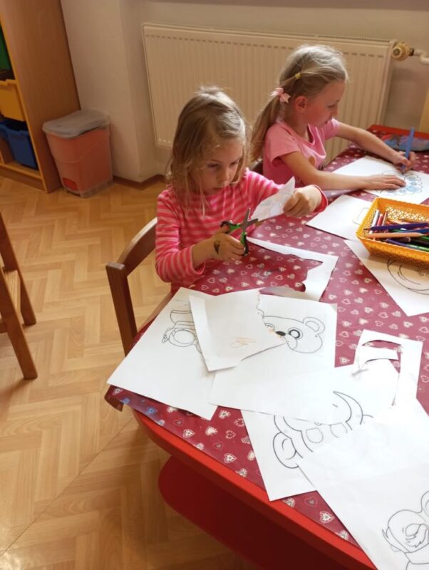 Když se zamyslíme nad tím, že je leden a venku to mnohdy vypadá jako na jaře, řekneme si, že zvířátka naši pomoc nepotřebují. Opak je však pravdou. S dětmi jsme si hráli na lesníky, kteří se starají o přísun potravy pro zvířátka v zimě. Seznamovali jsme se s názvy lesních zvířat, ale také těch, které žijí na severním pólu. Děti poznávaly stopy zvířat na obrázku, mísily odstíny modré barvy, zapouštěly ji do mokrého podkladu, kreslily zvířátka, vystřihovaly si čelenky. Zvířátka provázela děti ve všech centrech aktivit, starší děti skládaly písmenka dle vzoru, snažily se luštit tajenku, třídily barvy, učily se třídit zvířata, která spí a ta, která v lesích můžeme potkat i v zimě. Nechyběla ani dramatizace pohádek – v pohádce o rukavičce si připomněly děti dobro a klasickými pohádkami s maňásky uspávaly zvířátka před „zimním spánkem.