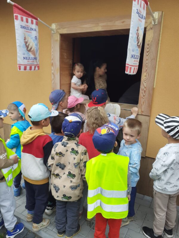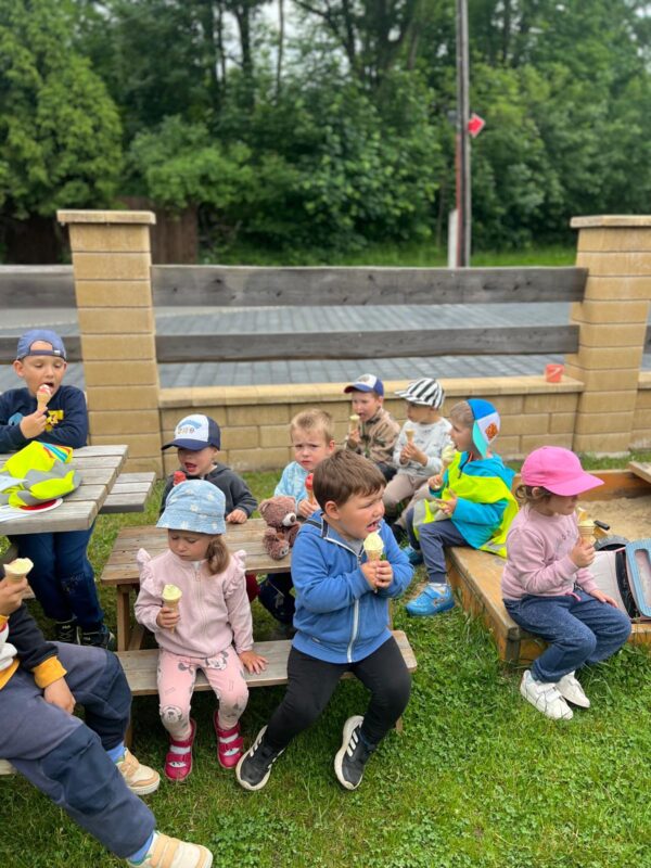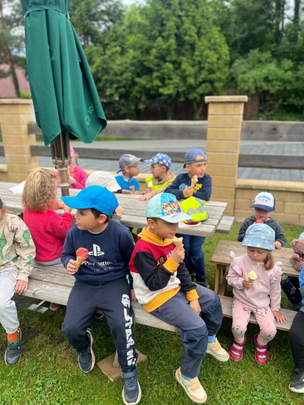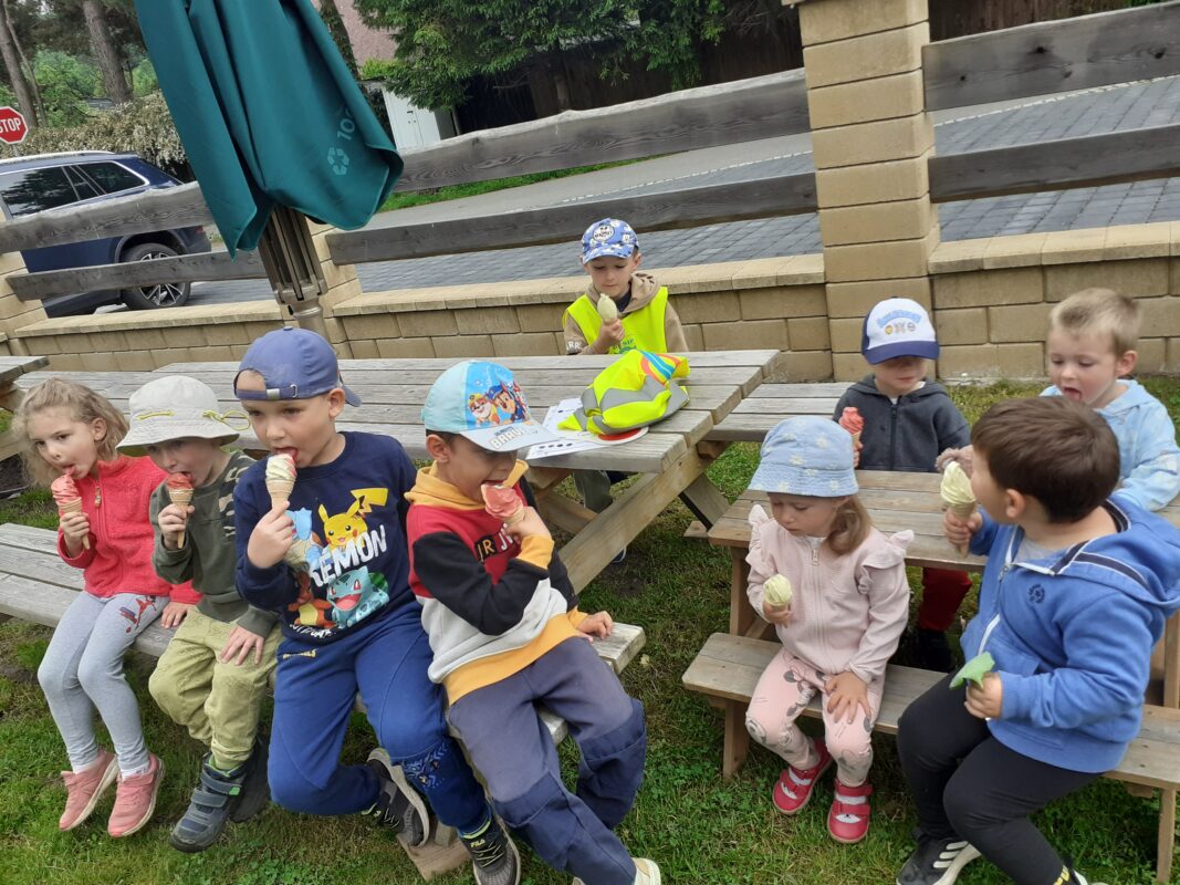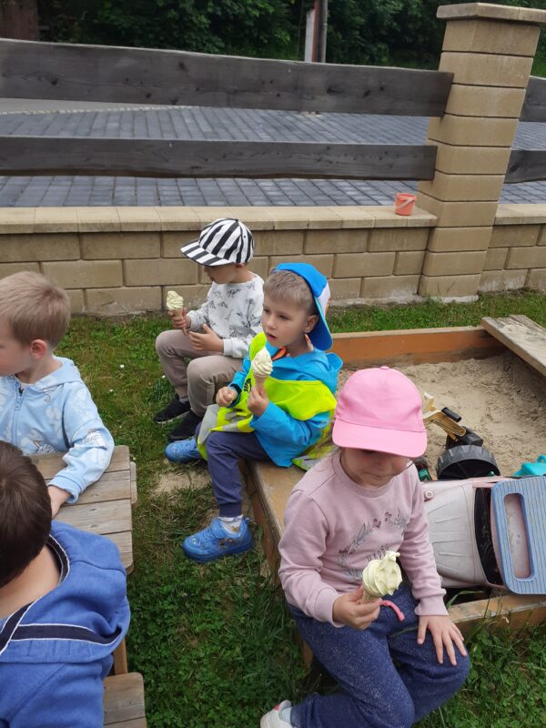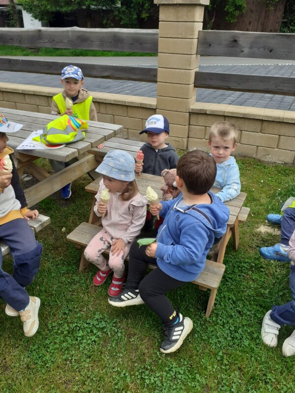 Moc děkujeme za pozvání paní Adamcové, která dětem z MŠ ke dni dětí darovala výbornou melounovo-vanilkovou zmrzlinu. Děti si před delší vycházkou zahrály hry, seznámily se s tématem, vytvářely zmrzlinu z papíru. Delší procházka nikomu nevadila, protože na jejím konci čekala slíbená dobrota.