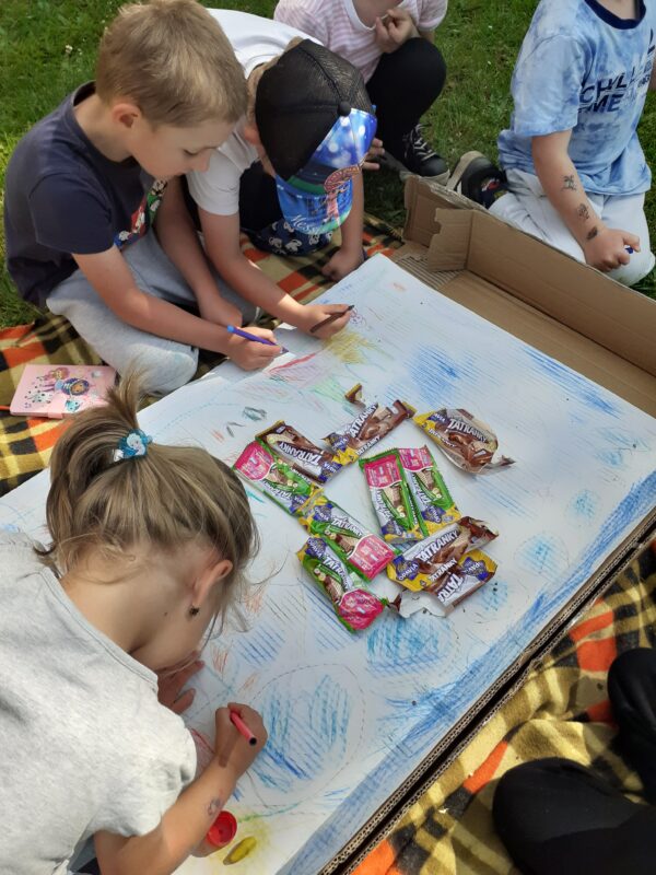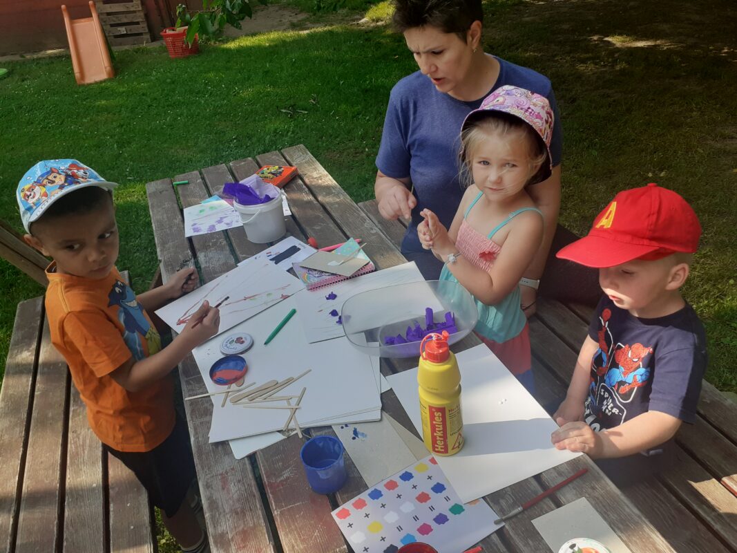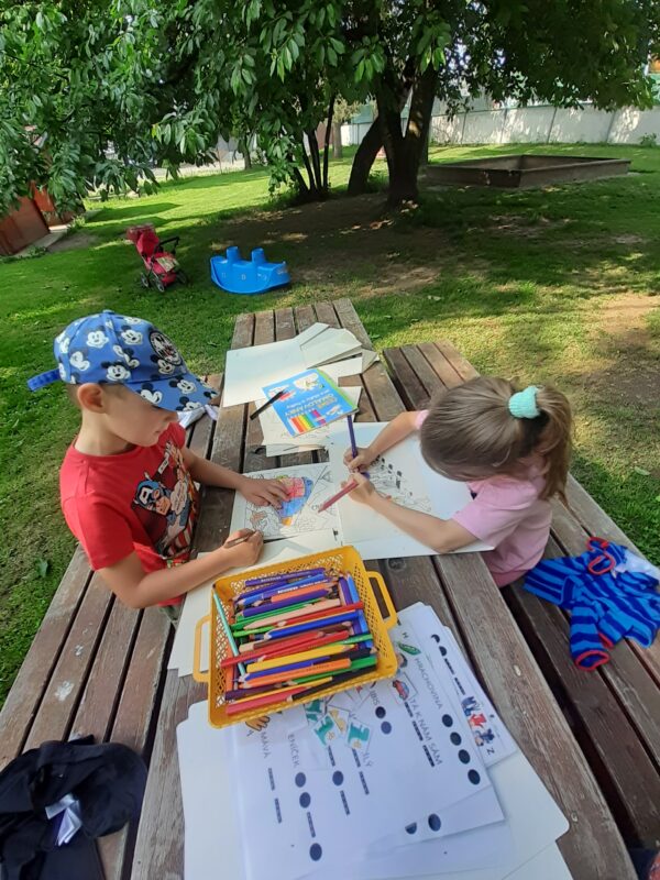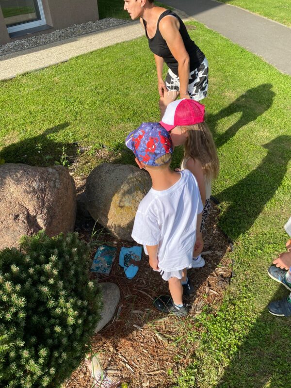Obrovskou radost nám udělala odpolední účast všech rodičů, sourozenců a přátel „školy“, kteří přišli na naši odpolední akci. Všem patří veliké poděkování za to, že se zúčastnili a přinesli občerstvení, abychom si při něm všichni vytvořili různé broučky, motýlky, stonožky a ty potom uložili na školní zahradě za doprovodu ukolébavky. Než nám uschnuly barvy a zešeřilo se, stihli jsme si zahrát hry na Mlsné mravence, Bystré housenky i na Hmyzí domečky. Následně jsme se vydali průvodem kolem Domu s pečovatelskou službou.