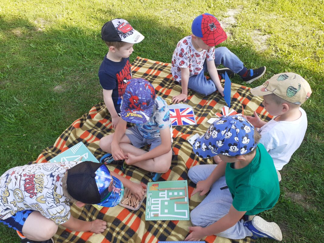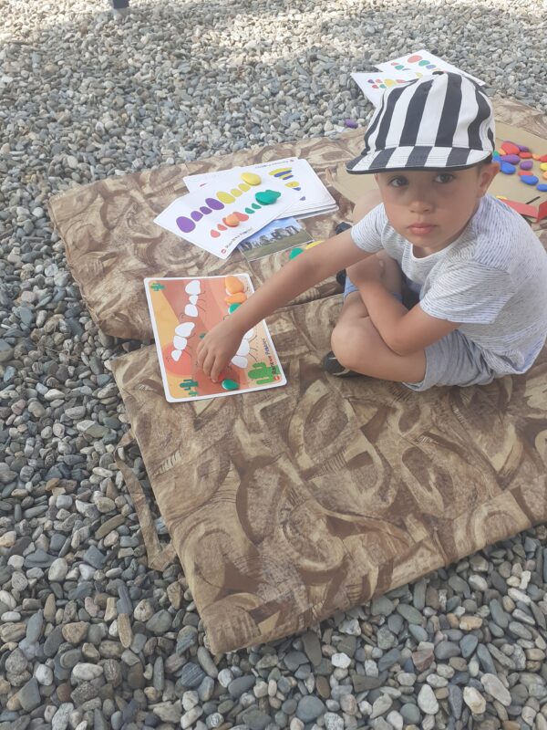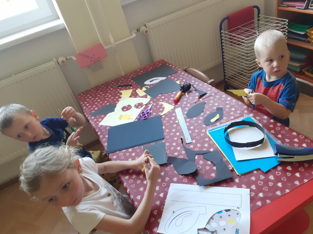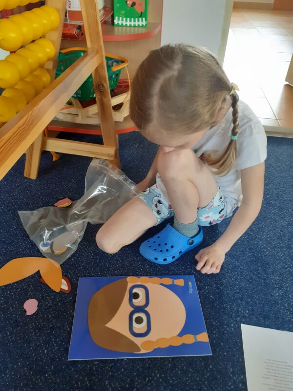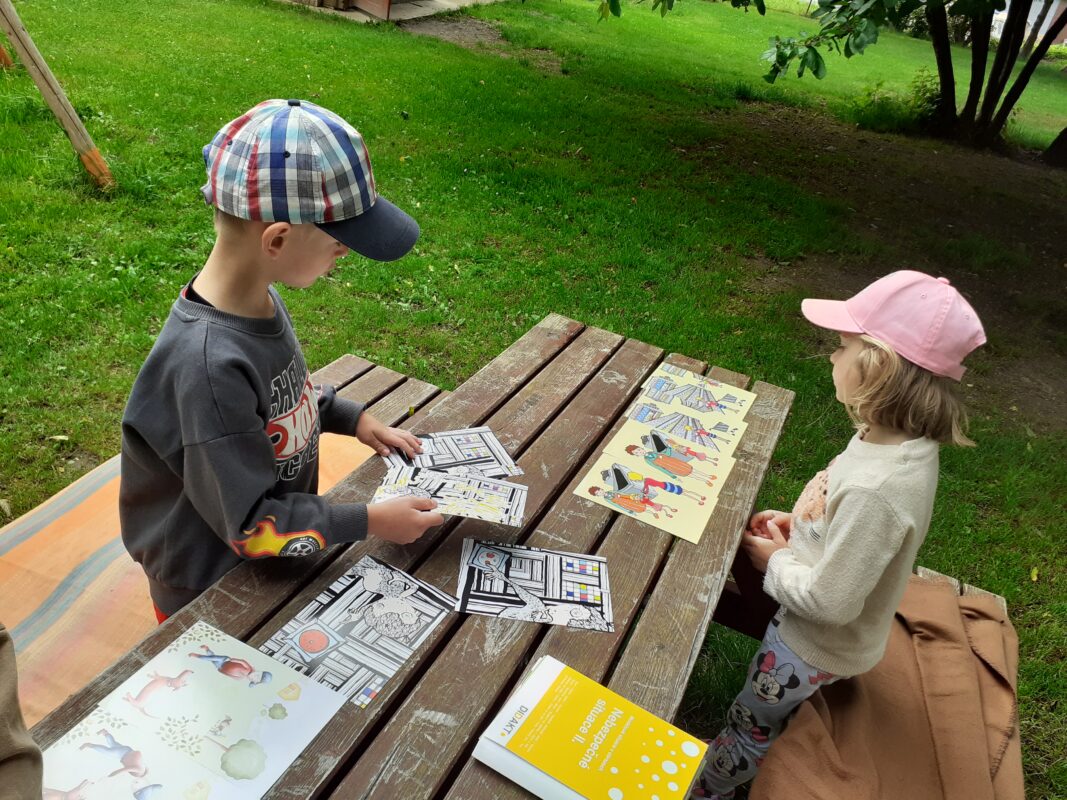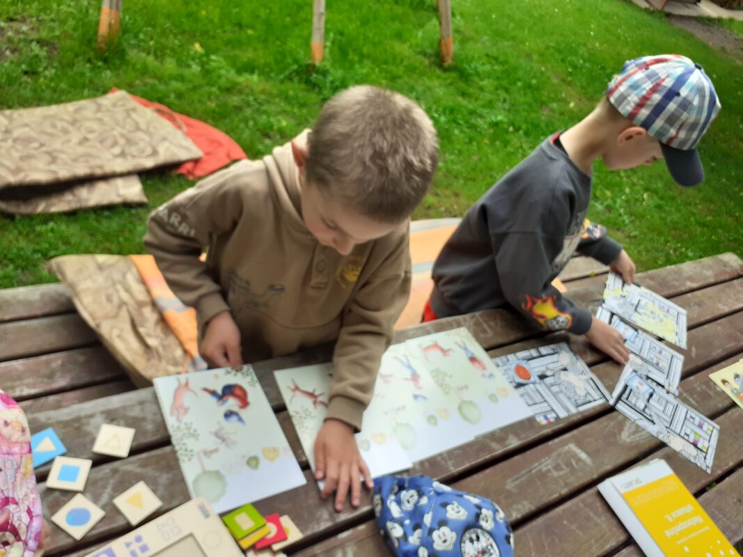 Skvělá stolní hra se stejným názvem jako náš projektový den nás provázela nejen tento den, ale i po zbytek týdne. Do hry se zapojovaly i mladší děti a troufám si říci, že proto, že se jim líbila „bitka“ vojáků a loupežníků :-). Děti se nejprve seznámily s pravidly hry, které nejsou na první pohled vůbec jednoduché. Učily se porovnávat množství, určovat, co je více a méně, opakovaly číselnou řadu a seznamovaly se s číslicemi 1 – 5. Na kartách ze hry si děti prohlížely jednotlivé loupežníky a popisovaly, jak vypadají. Poté je také zkoušely nakreslit pastelkami. V knížkách o Rumcajsovi jsme si připomněli, že vlastně už nějakého loupežníka známe a prohlíželi jsme si obrázky v knihách. Protože Rumcajs nebyl jen loupežníkem, vyzkoušeli jsme si také ševcovské řemeslo – přiťukávali jsme podrážky a nejen to, také jsme se snažili Mance zavázat střevíček. Děti se učily zavázat uzlík, mašličku budeme trénovat ještě dlouho. Děti se seznámili s pojmem „lup“ a připomněli jsme si, že cizí věci nikdy bez dovolení nebereme. Někteří „loupežníci“ hledali svůj lup mezi mnoha drobnými obrázky a jiní dostávali zadání, jak má jejich lup vypadat. Děti hledaly podle materiálu, barvy, tvaru nebo velikosti. Následně v Kimově hře určovaly, co jim jejich velitel vzal sám pro sebe.