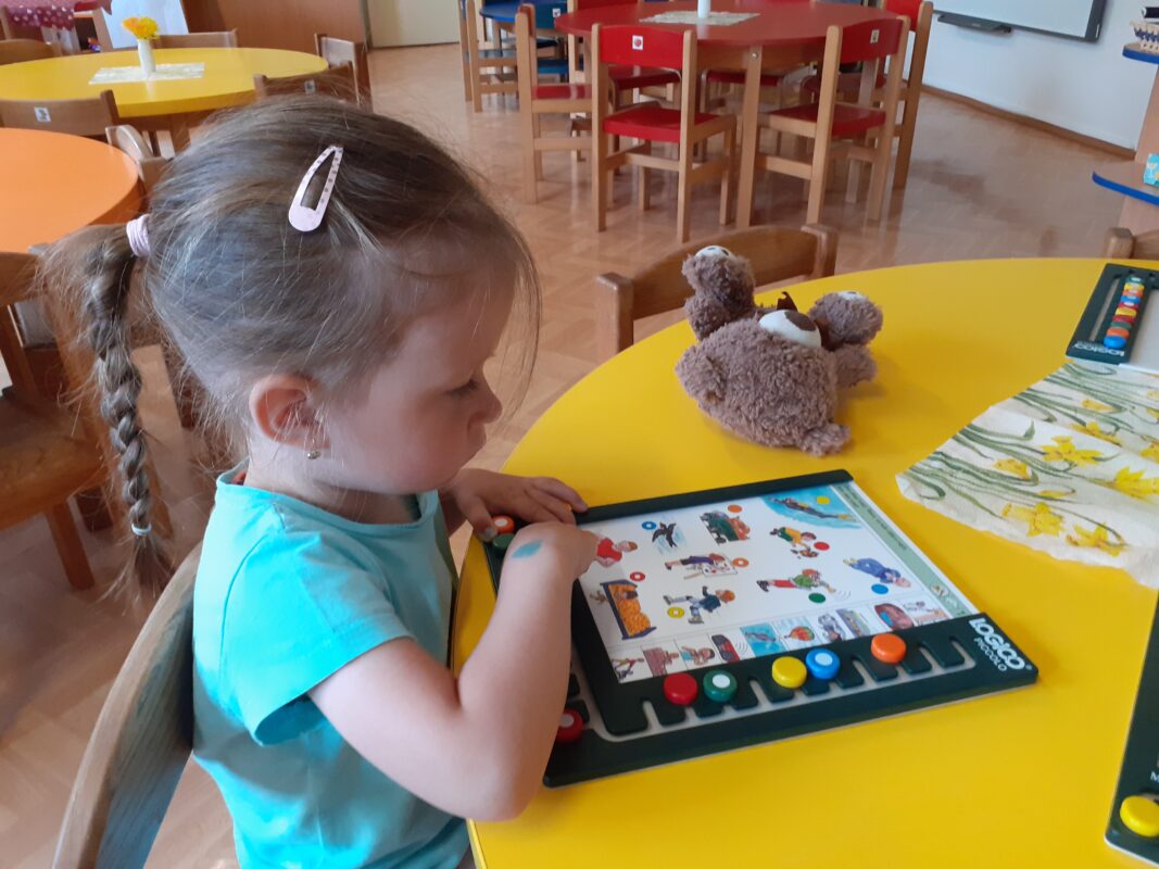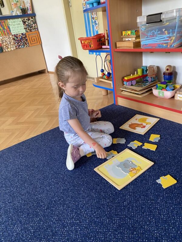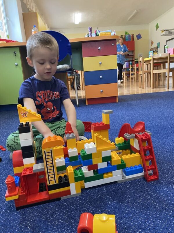 Po prázdninách jsme se opět sešli a přivítali jsme mezi sebou nové kamarády, kteří se seznamovali s prostředím MŠ, zahrady, s učitelkami i dětmi. Učili jsme se společně respektovat pravidla vytvořených center, hráli jsme společenské hry, stavěli jsme školku z různých druhů stavebnic, kreslili jsme do písku a na tablet prstíkem, na papír pastelkami. Všichni jsme přes prázdniny povyrostli, a tak jsme zkoušeli zvětšit také gumového medvídka či sušenou švestku. První týden se neobešel bez pláče, ale i plačtivé tvářičky si později během dne užily mnoho zábavy i legrace.