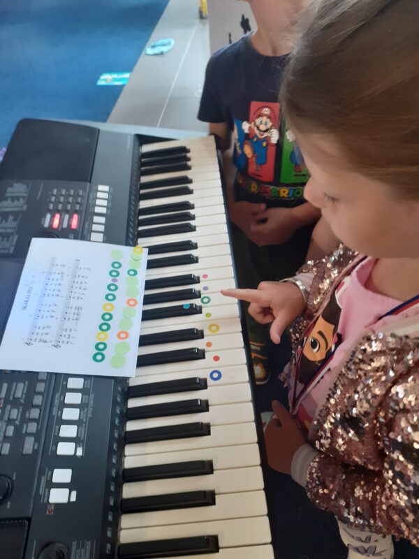 Děti si hrají nejen s písničkami, ale také hudebními nástroji, barevnými zvonečky a notičkami. Děti si velmi oblíbily „sestavování“ barevných notiček pro hru na zvonky nebo klávesy a jedno z nich bylo tak odvážné, že svou hru představilo také veřejnosti. Děti potěšily (doufám, že nejen) ženy zpěvem písniček a básničkou o babičce a sluníčku. Děkujeme panu starostovi za pozvání a odměnu.