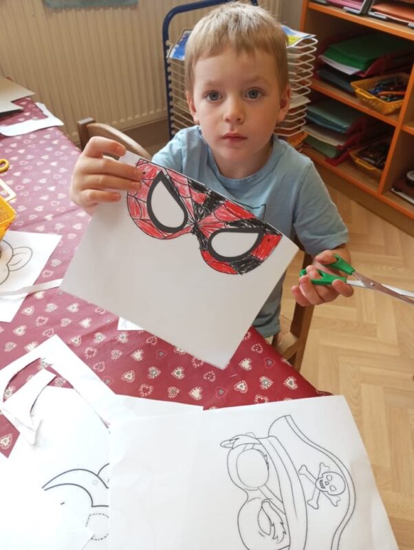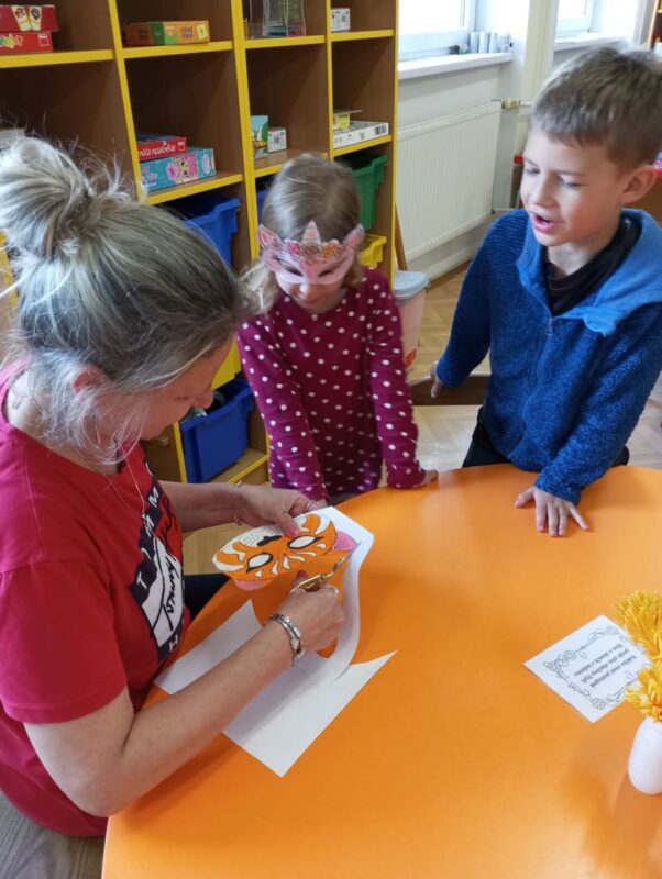 V pátek do mateřské školy přicházely děti nastojené do „maškar“. S dětmi jsme si povídali, jaký úkol má v průvodu konkrétní maškara a seznámili jsme se s těmi „tradičními“. Navštívili jsme nejprve kamarády z