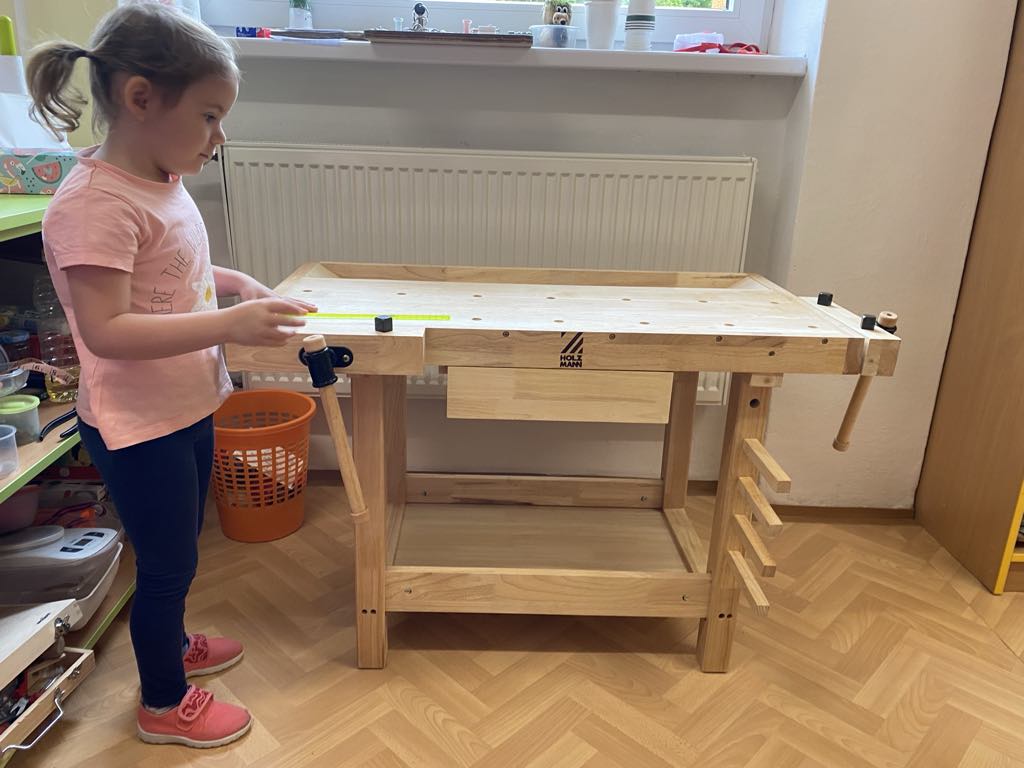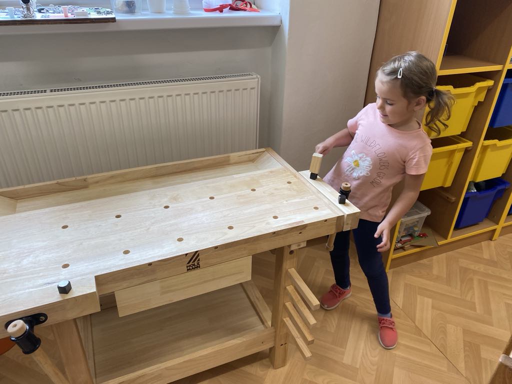 V tematické části s tímto názvem se děti seznamovaly s názvy některých stromů, rozlišovaly listnaté a jehličnaté stromy, učily se pojmenovat části stromů, ale také jejich plody. Lesní zvířata nás provázela všemi činnostmi a nechyběly puzzle, pexesa, pexetria, různé obrázky a to nejen ve třídě, ale také na naučných tabulích na školní zahradě. Děti se učily praktickým dovednostem jako je vrtání ruční vrtačkou, řezání pilkou, zatloukání hřebíků. Seznamovaly se s vlastnostmi dřeva i jeho využitím. Dělaly pokusy se zápalkami a zkoušely je rozpohybovat, dlouhodobě pozorovaly působení vody na šišku – co se s ní stane v suchu a co ve vodě? Děti stavěly ze stavebnic různé stroje, které pomáhaly natěžené dřevo vyvážet. Cvičení a pohybové hry byly motivované procházkami lesem, zvířátky i stromy. Nechybělo sbírání listí, navlékání na špejle, hrabání, nebo třeba vylézání na strom. (lísku děti poznají bezpečně 🙂 a o vylézání na ni říkají: „mě to baví“ :-))