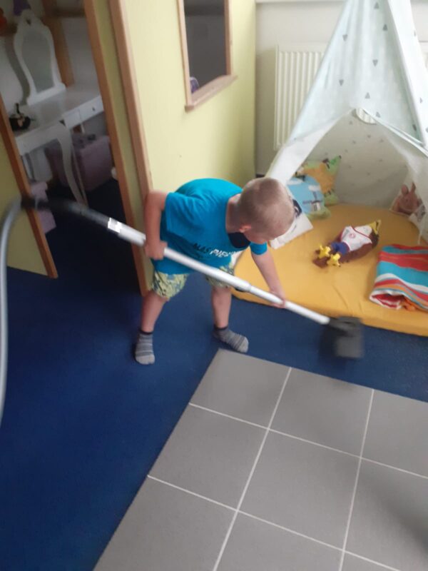 První polovinu května jsme věnovali tématu Moje rodina. Připomněli jsme si, že vždy druhou neděli v květnu slaví naše nejdražší maminky svátek a vyrobili jim přáníčka. Děti si navzájem sdělovaly jména svých rodičů, a také domácích mazlíčků… Zpívaly a učily se pomocí barevných koleček samostatně vytvořit notový záznam písničky, cvičily a hrály různé pohybové hry, procvičovaly počítání, jemnou motoriku při stříhání, krmení miminka a kuřátka, při zdobení kabelky provázkem a navlékání barevných gumiček na barevné válce, při věšení prádla, při dojení kravičky. Dramatizovaly pohádky, konstruovaly ze stavebnic domečky, auta… Experimentovaly při pokusech s vodou, olejem, práškem do pečiva, barvami a vytvářely barevný déšť, různými výtvarnými technikami ztvárnily svou rodinu a kašírovaly pejska Chase. Při měření své výšky porovnávaly o kolik centimetrů od září vyrostly, při pobytu venku procvičovaly chůzi na chůdách, skok do dálky a pro potěšení vytvářely smyslovou láhev.