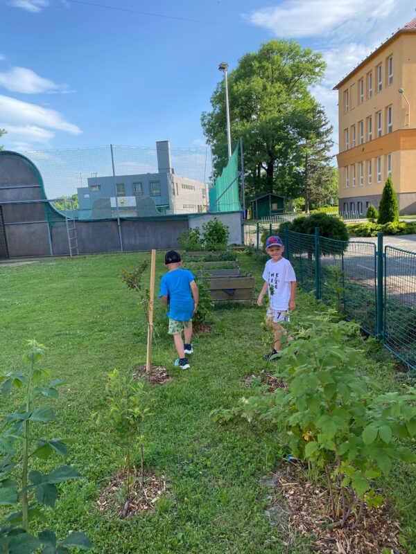 V tematické části se děti seznamovaly s názvy ovoce a zeleniny, opakovaly podmínky potřebné pro růst rostlin, přemýšlely, které nářadí je potřeba při práci na zahradě. Mladší děti třídily podle barev, velikosti, starší děti už se snažily třídit do skupin (ovoce, zelenina). Tvořili jsme nadřazené pojmy, kreslili, malovali, modelovali i procvičovali prstíčky. Starší děti si opakovaly názvy geometrických tvarů a všichni jsme si zpívali, tvořili z jablíček a rozinek chutného ježečka.