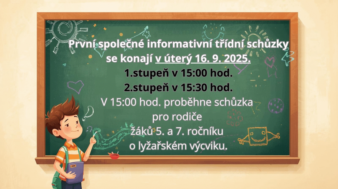 První společná třídní schůzka s rodiči žáků 1. ročníku proběhne 1. 9. 2022 po slavnostním zahájení školního roku a přivítání prvňáčků.