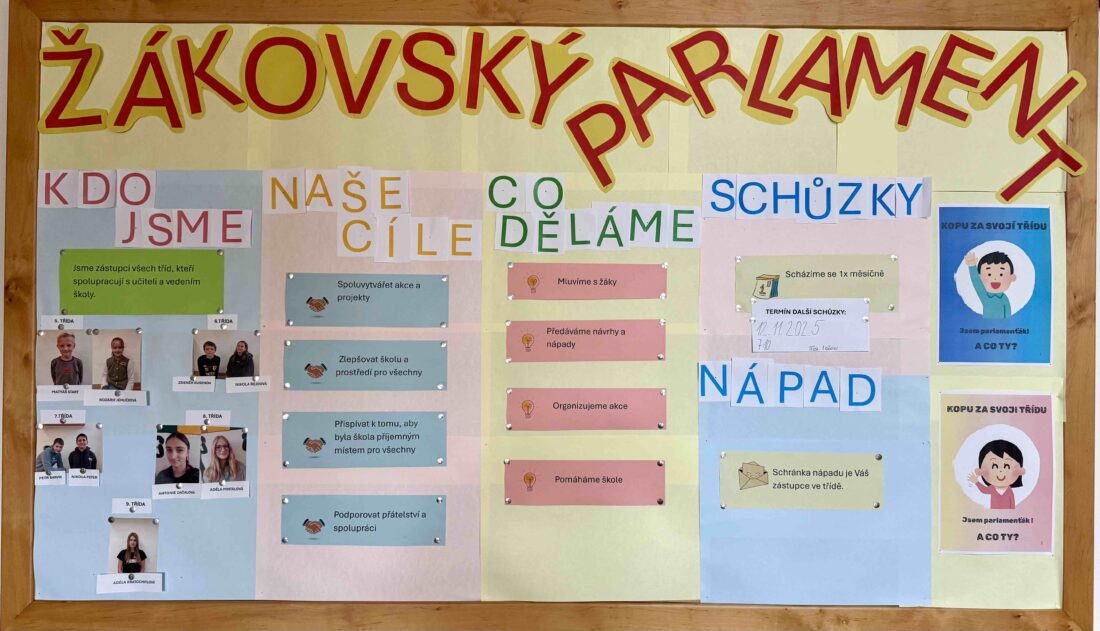 Na chodbě školy jsme pro žáky připravili novou nástěnku žákovského parlamentu, která představuje jeho členy, cíle i činnosti. Žákovský parlament tvoří zástupci všech tříd, kteří spolupracují s učiteli a vedením školy. Na nástěnce se mohou žáci seznámit s jednotlivými zástupci a dozvědět se, jakou roli parlament ve škole plní. (17.10.2025 – Chvístková)